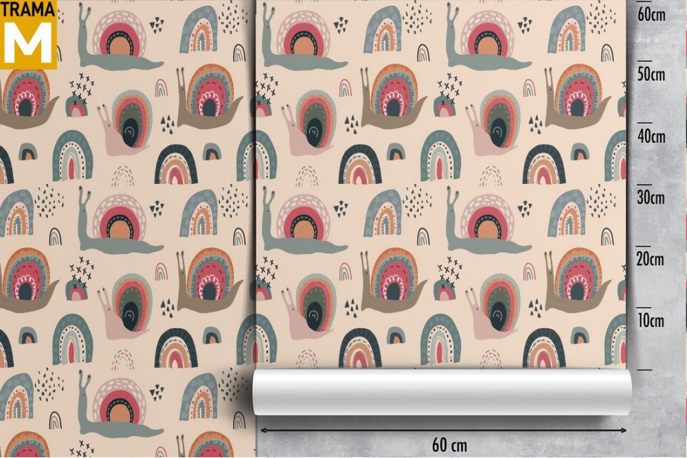 Children's wallpaper with rainbows and snails.