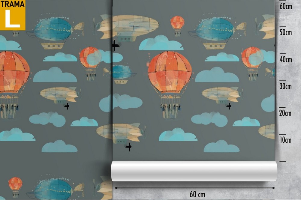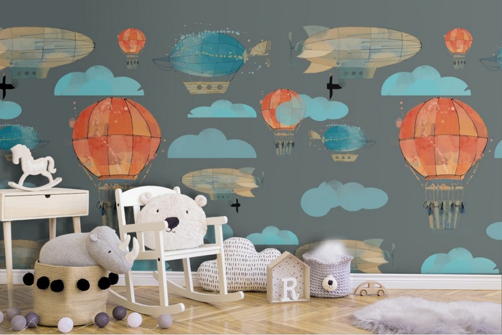 Hot air balloons and clouds children's wallpaper decoration.
