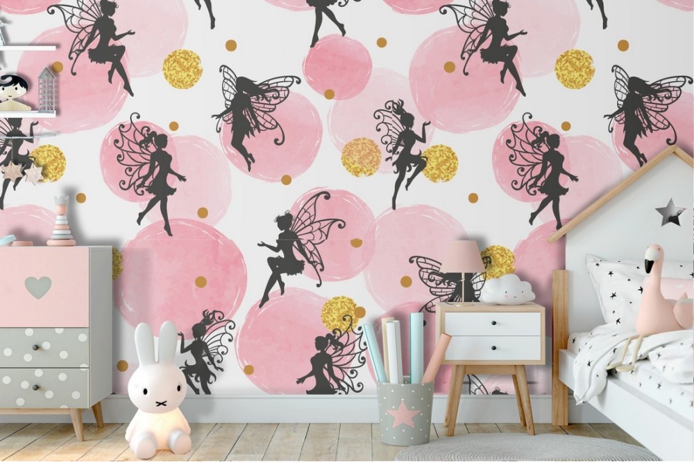 Fairy and polka dot wallpaper children's fantasy decoration.
