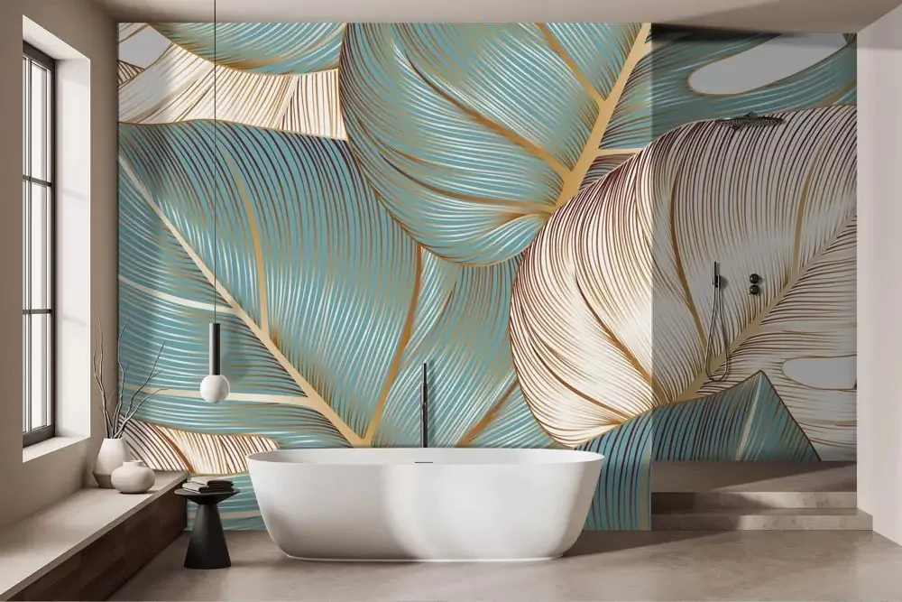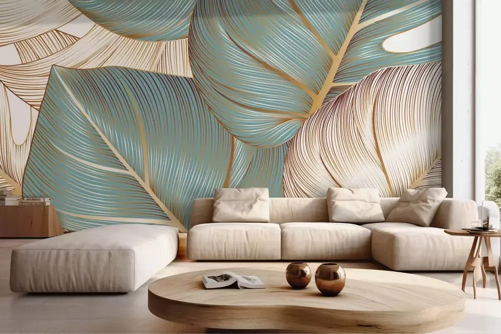 Carta da parati foglie tropicali dorate, elegante e luminosa. Ideale per zone giorno luminose. Artigianale italiana.