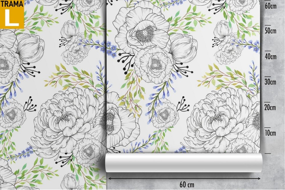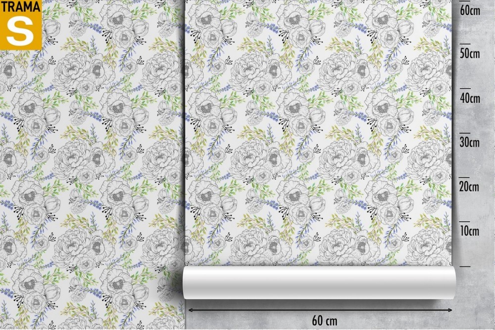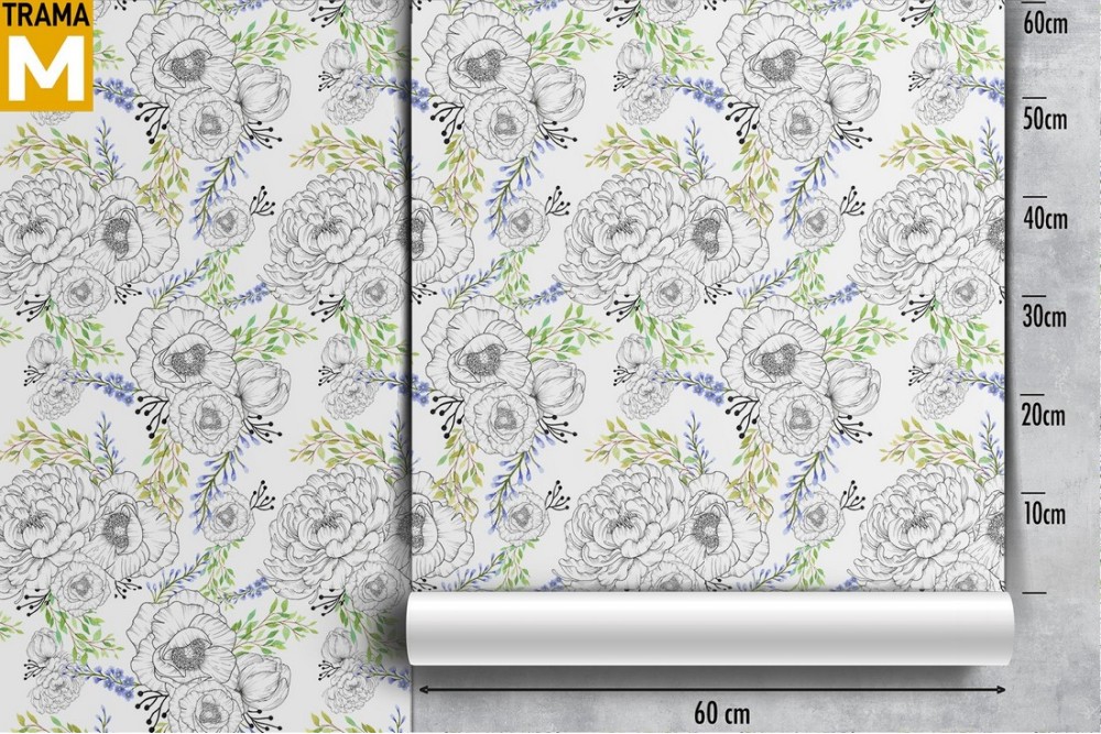 Wallpaper with stylized flowers and leaves pattern.
