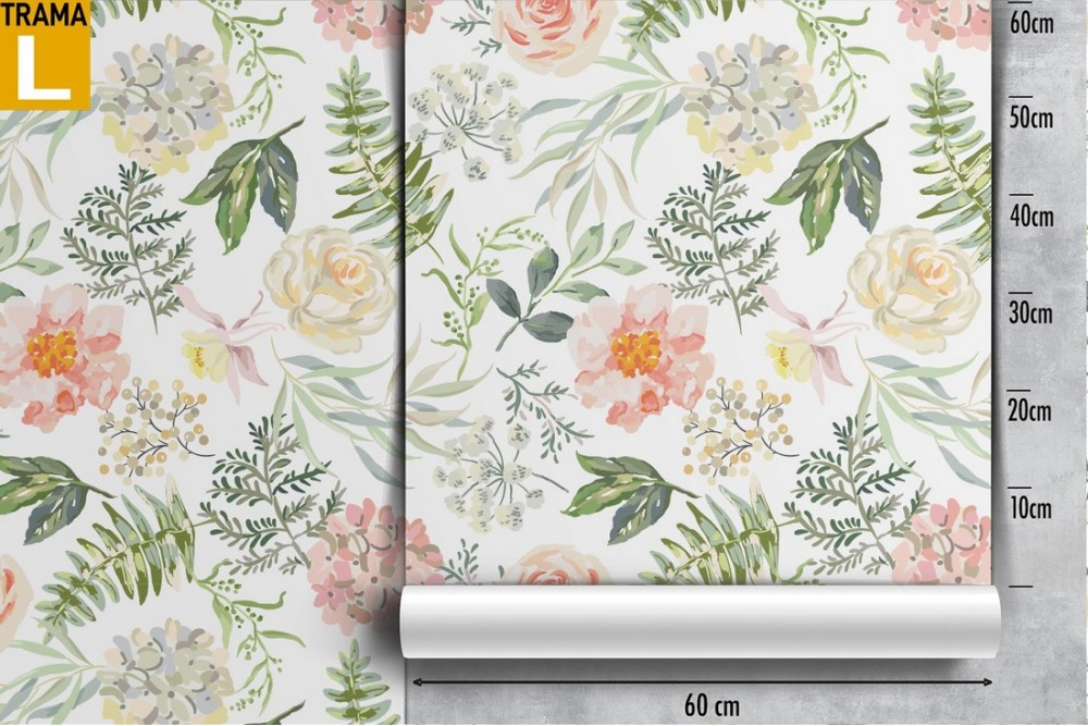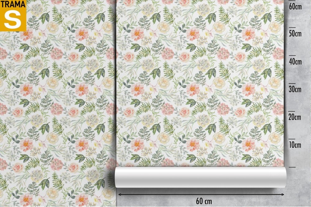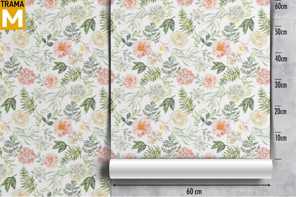 Wallpaper with leaves and flowers, vintage nature decoration.