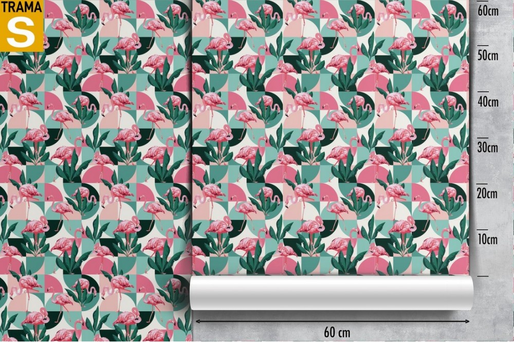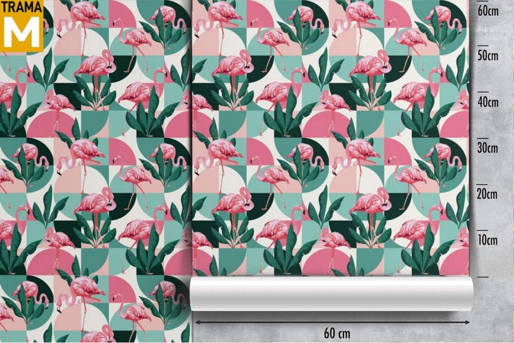 Flamingo and tropical leaves wallpaper with modern geometries.