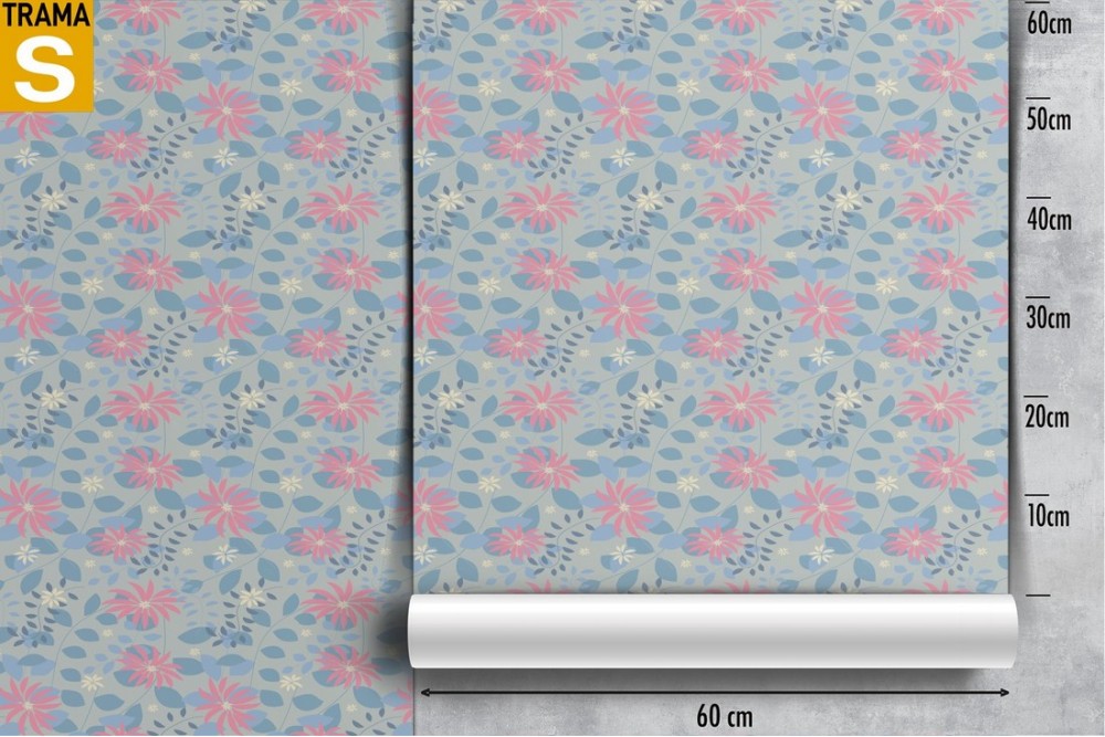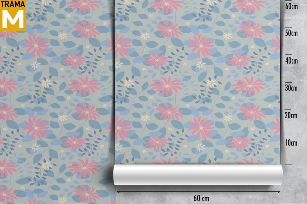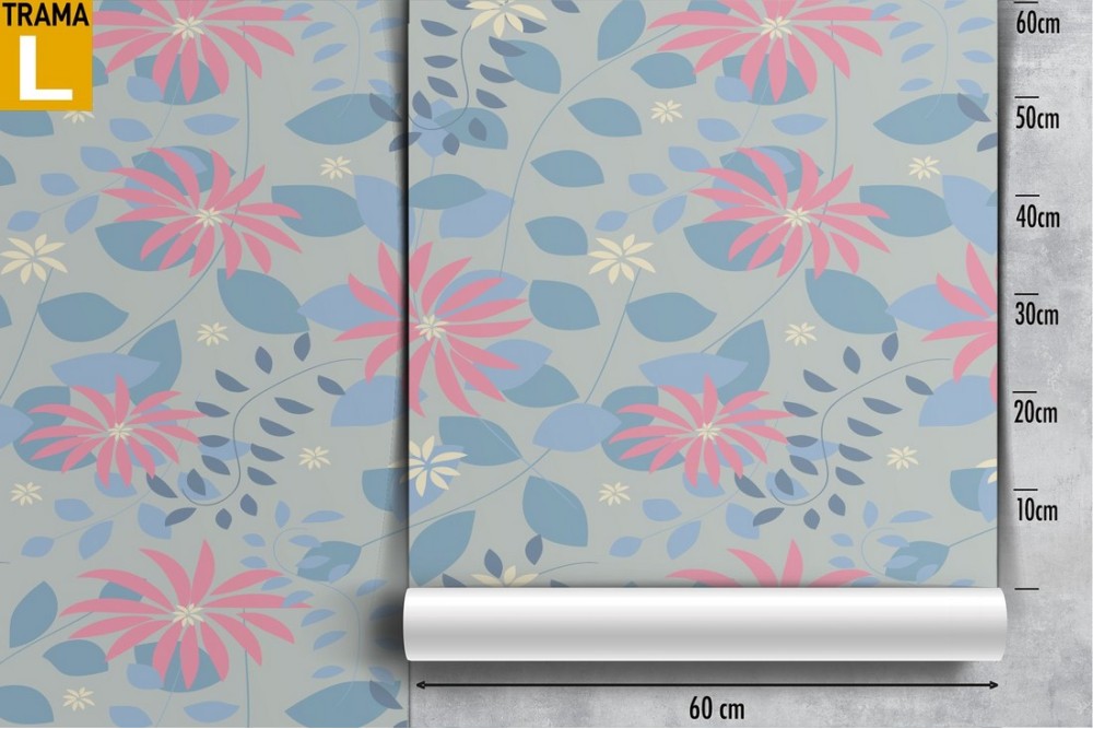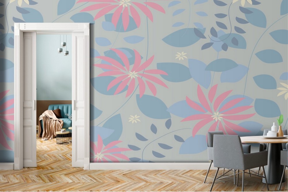 Wallpaper with stylized pink flowers and light blue leaves.