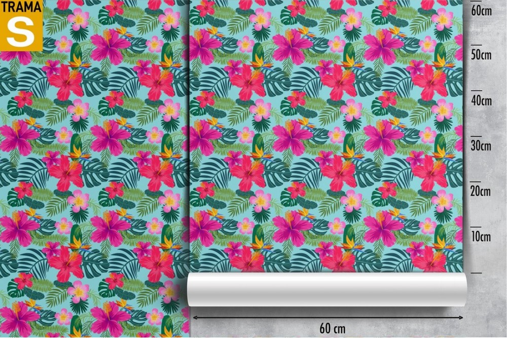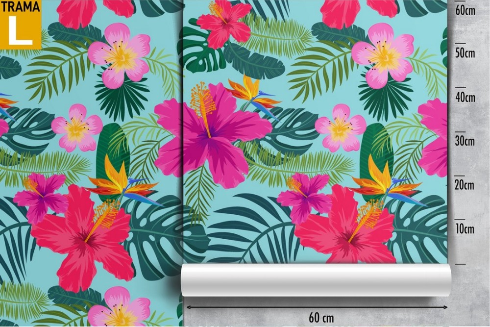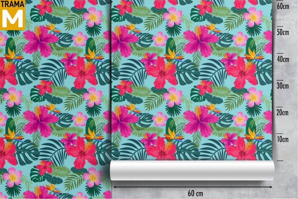 Modern pink wallpaper with tropical flowers and leaves.