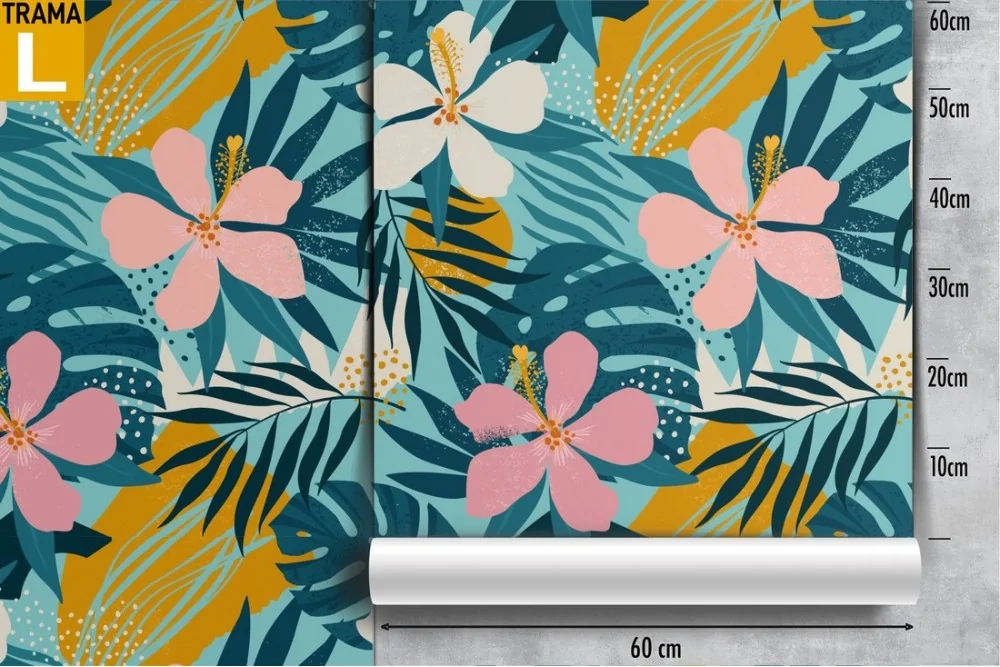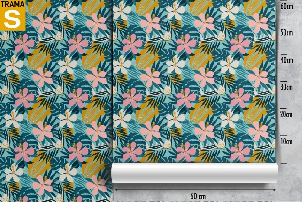 Wallpaper with stylized tropical flowers and leaves.