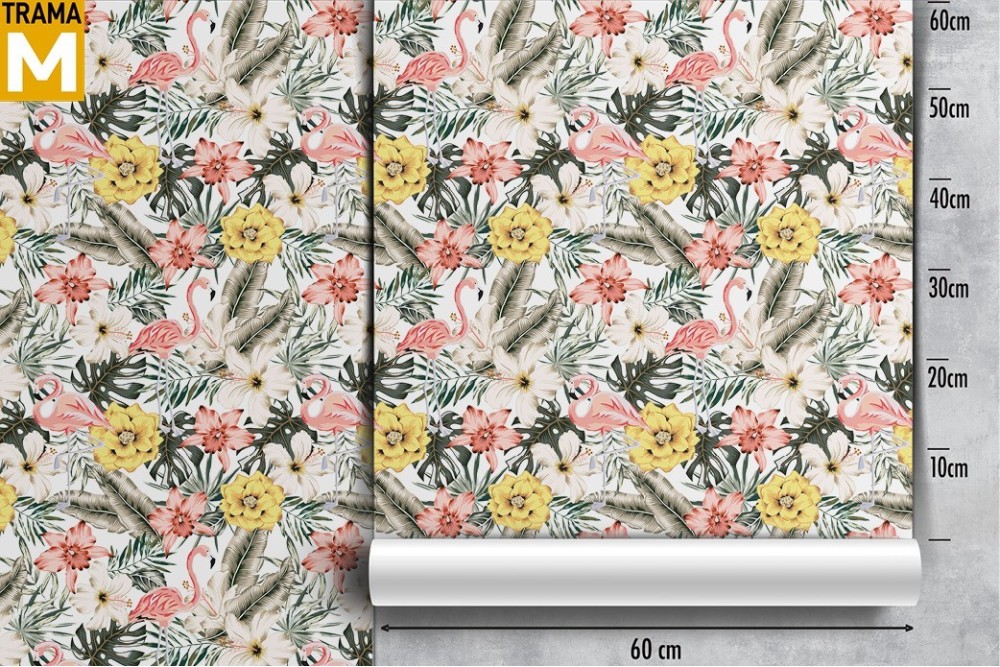 Wallpaper with tropical flowers, leaves and animals in a vintage pattern.