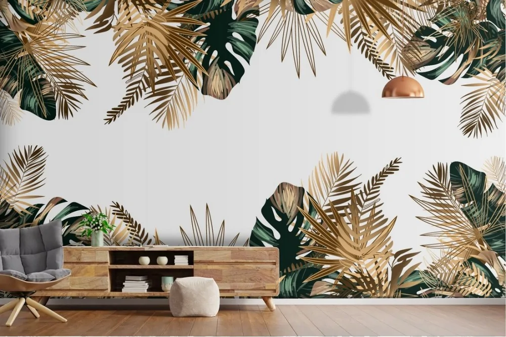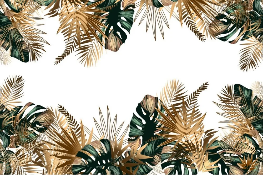 Tropical green and gold leaf wallpaper decoration details