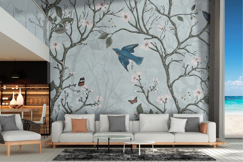 Adhesive Wallpaper with trees, birds, spring, pastel Japanese
