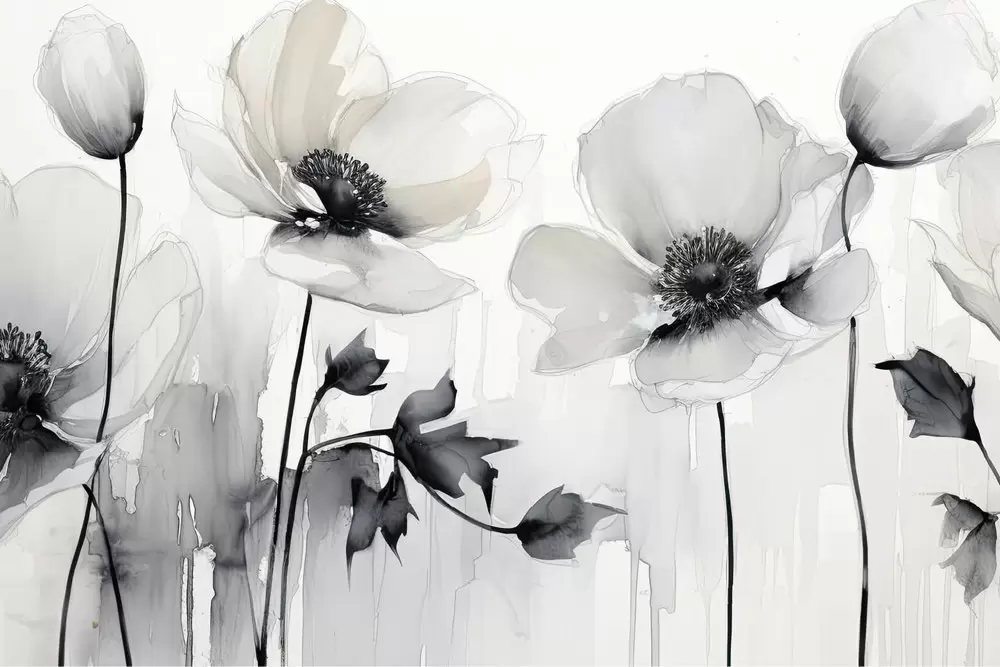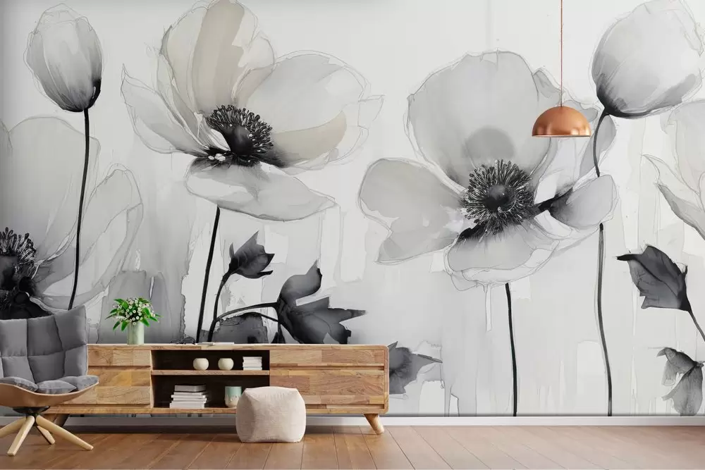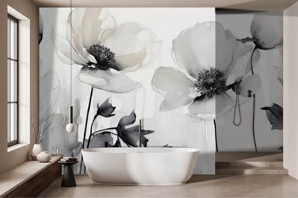 Carta da parati fiori stilizzata, morbida e rilassante. Ideale per camere e zone relax. Realizzata con materiali sostenibili.