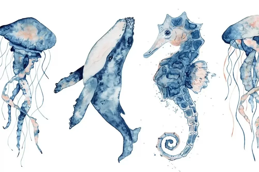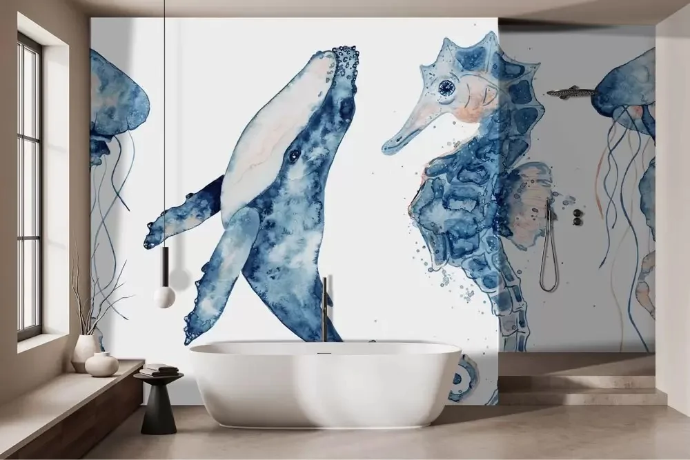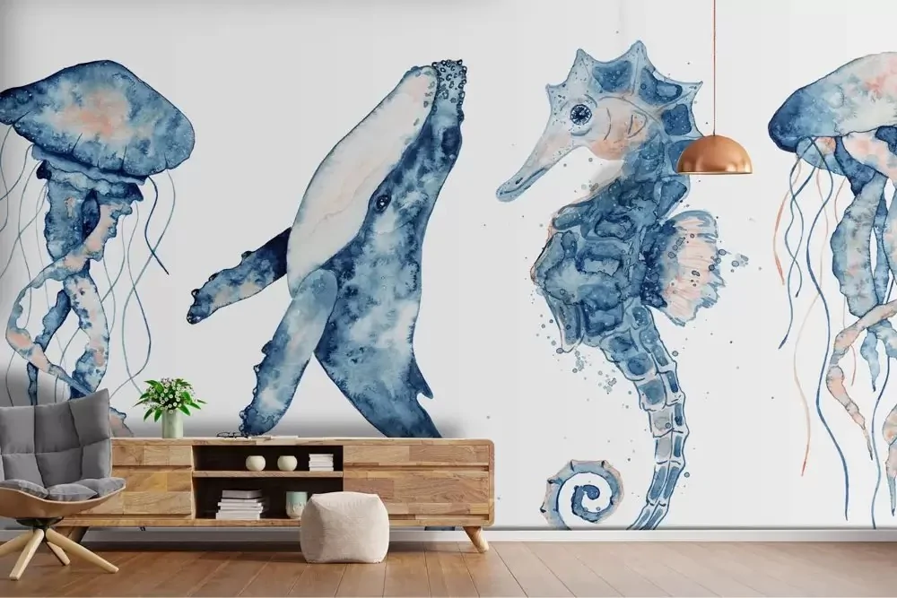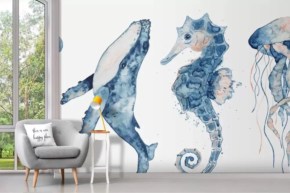 Carta da parati animali marini acquerello, raffinata e moderna. Ideale per ambienti moderni. Personalizzabile su misura.