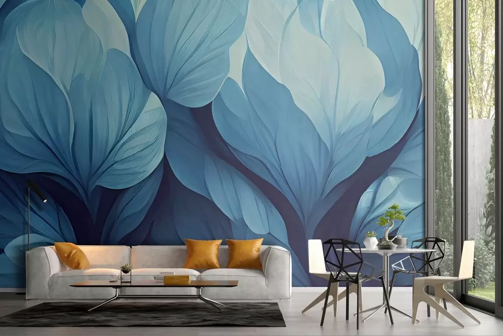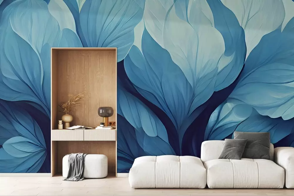 Carta da parati foglie blu intenso astratte, vivace e naturale. Ideale per zone giorno luminose. Ecologica e personalizzabile.