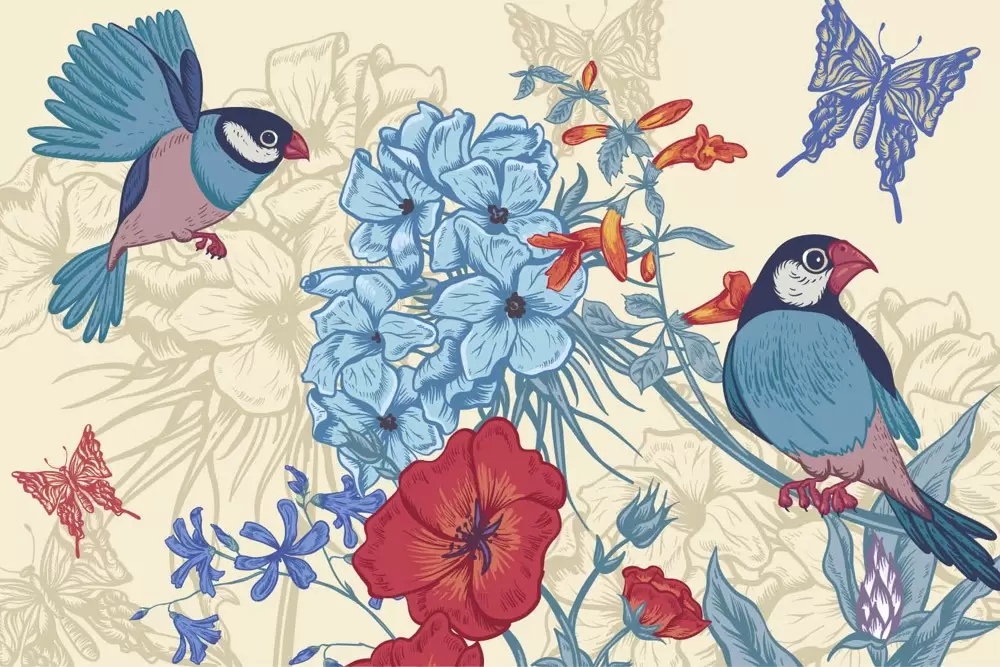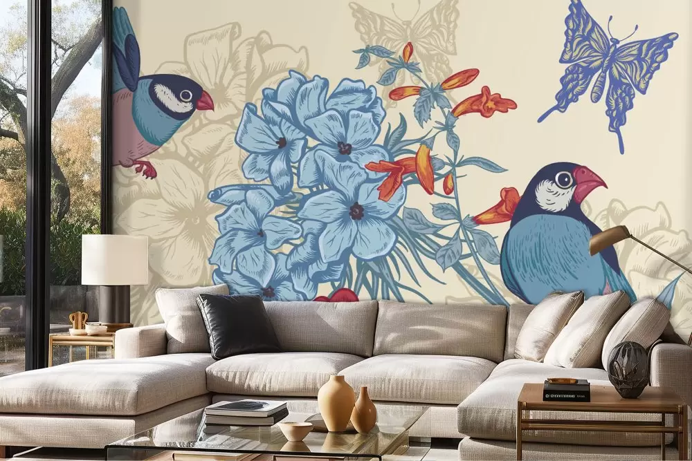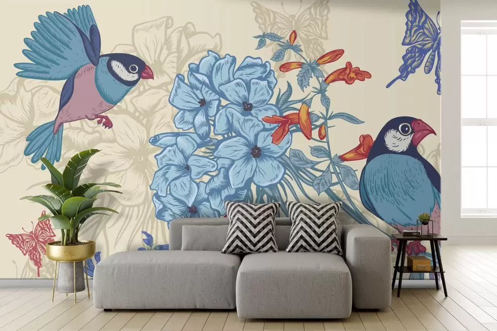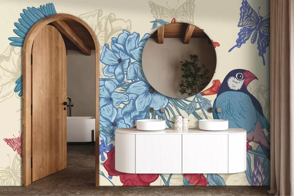 Carta da parati floreale con uccelli, scenografica e di carattere. Ideale per camere e zone relax. Personalizzabile su misura.