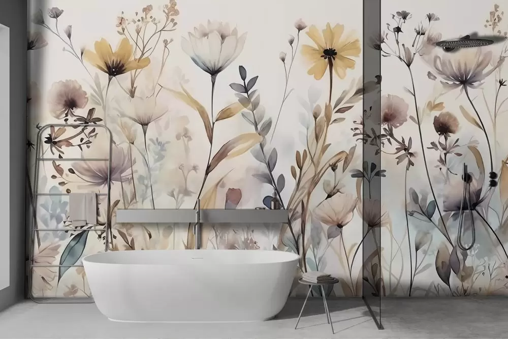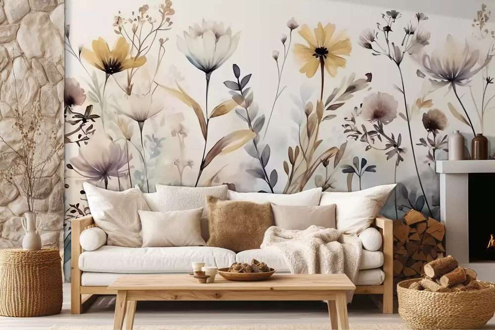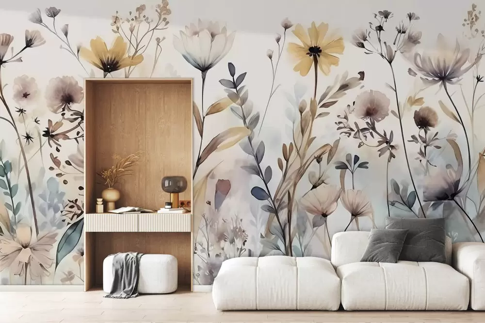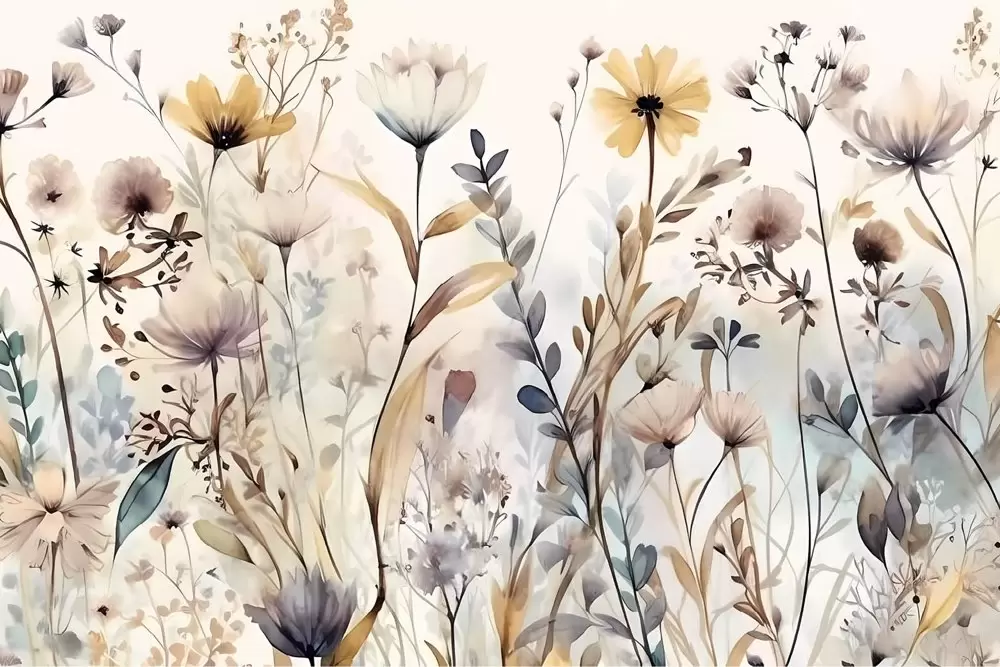 Carta da parati fiori di campo vintage acquerello, sofisticata e chic. Ideale per camere e zone relax. Realizzata con materiali sostenibili.