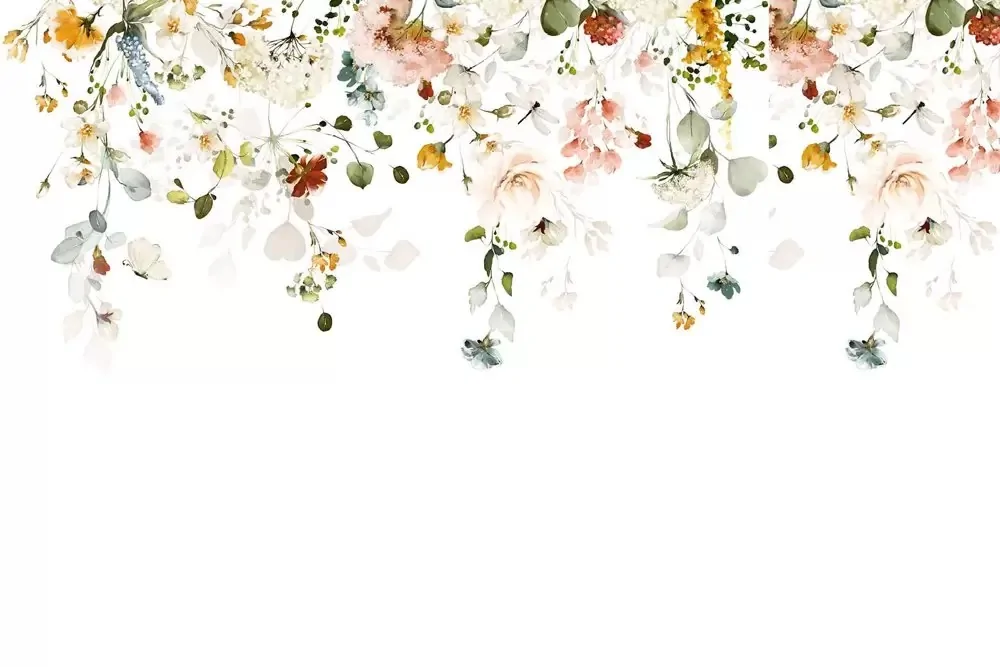 Carta da parati fiori sospesi su fondo bianco, raffinata e moderna. Ideale per camere e zone relax. Personalizzabile su misura.