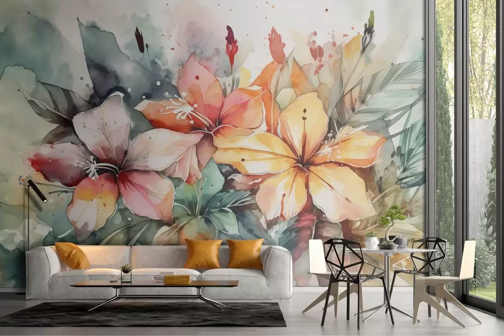 Carta da parati fiori vivaci acquerello, scenografica e di carattere. Ideale per camere e zone relax. Personalizzabile su misura.