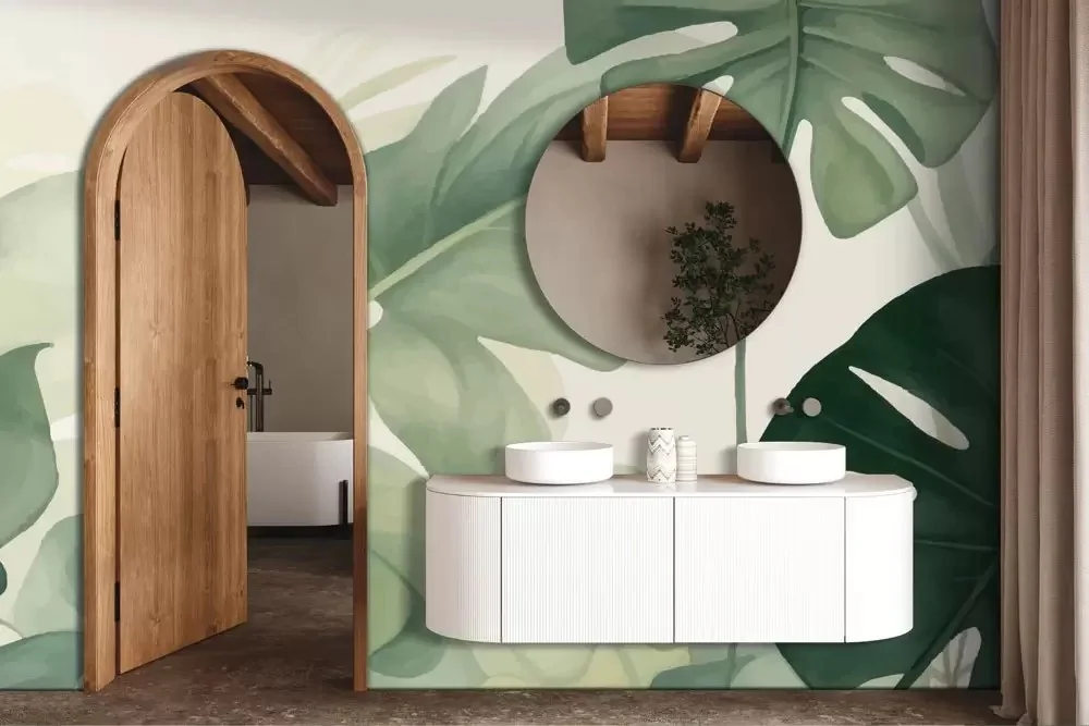 Bagno fresco e rilassante con decorazioni tropicali per pareti