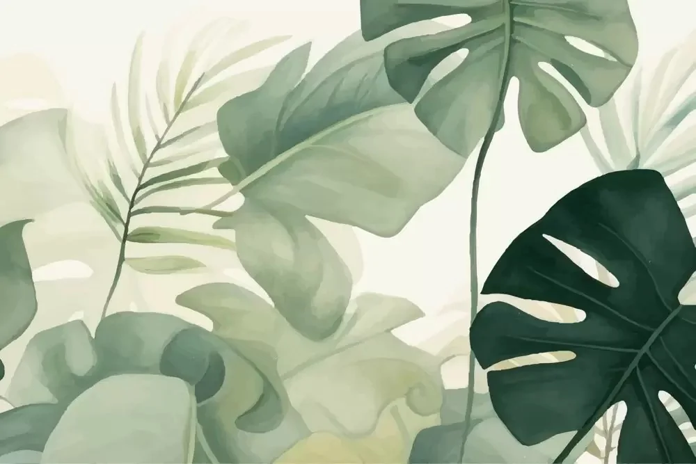 Carta da parati foglie tropicali tonalità del verde tenui acquerello, morbida e rilassante. Ideale per zone giorno luminose. Realizzata con materiali sostenibili.