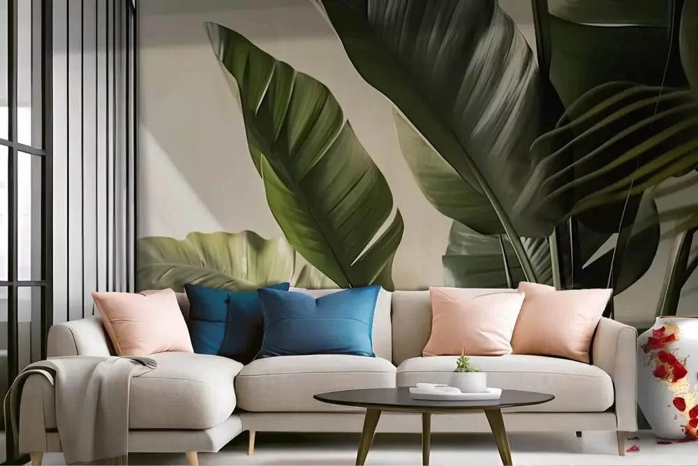 Carta da parati foglie tropicali realistiche, elegante e luminosa. Ideale per zone giorno luminose. Artigianale italiana.