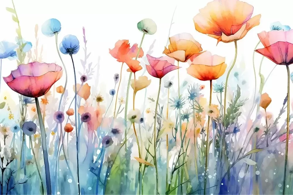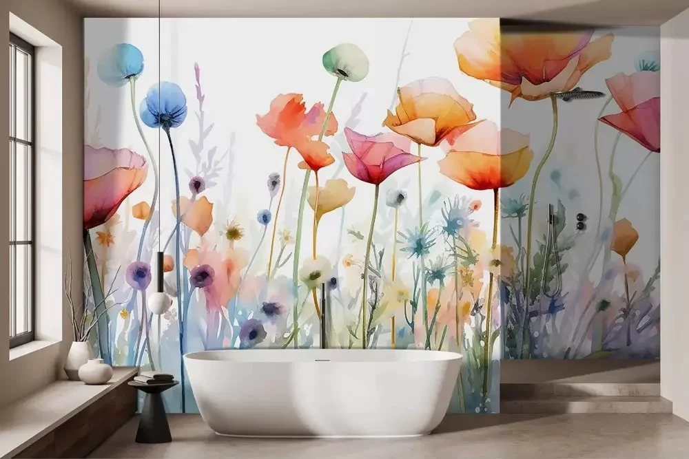 Carta da parati fiori acquerello vivaci, grafica e contemporanea. Ideale per camere e zone relax. Inchiostri a base d’acqua, atossici.