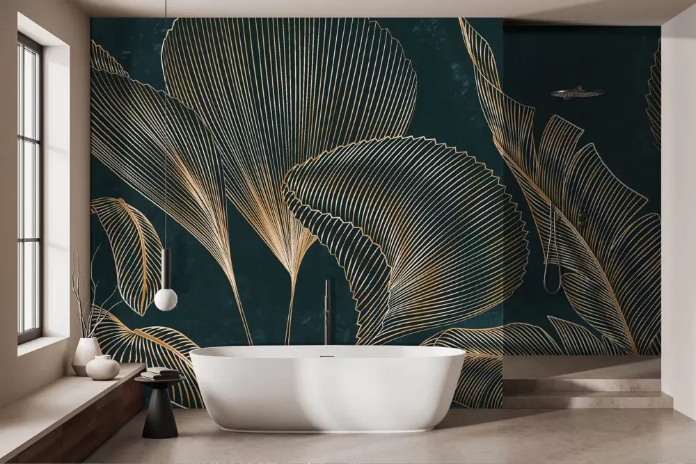 Carta da parati foglie tropicali dorate luxury, delicata e armoniosa. Ideale per soggiorni eleganti. Ecologica e personalizzabile.