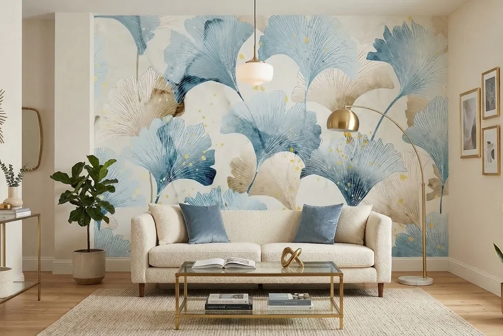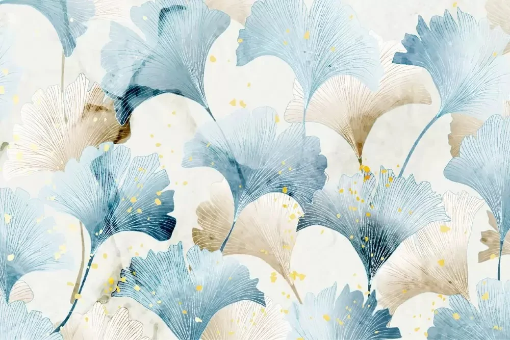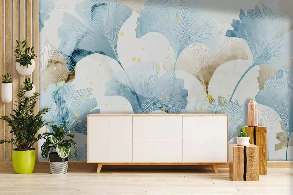 Carta da parati fiori stilizzati celeste e beige, scenografica e di carattere. Ideale per camere e zone relax. Personalizzabile su misura.