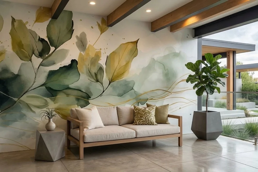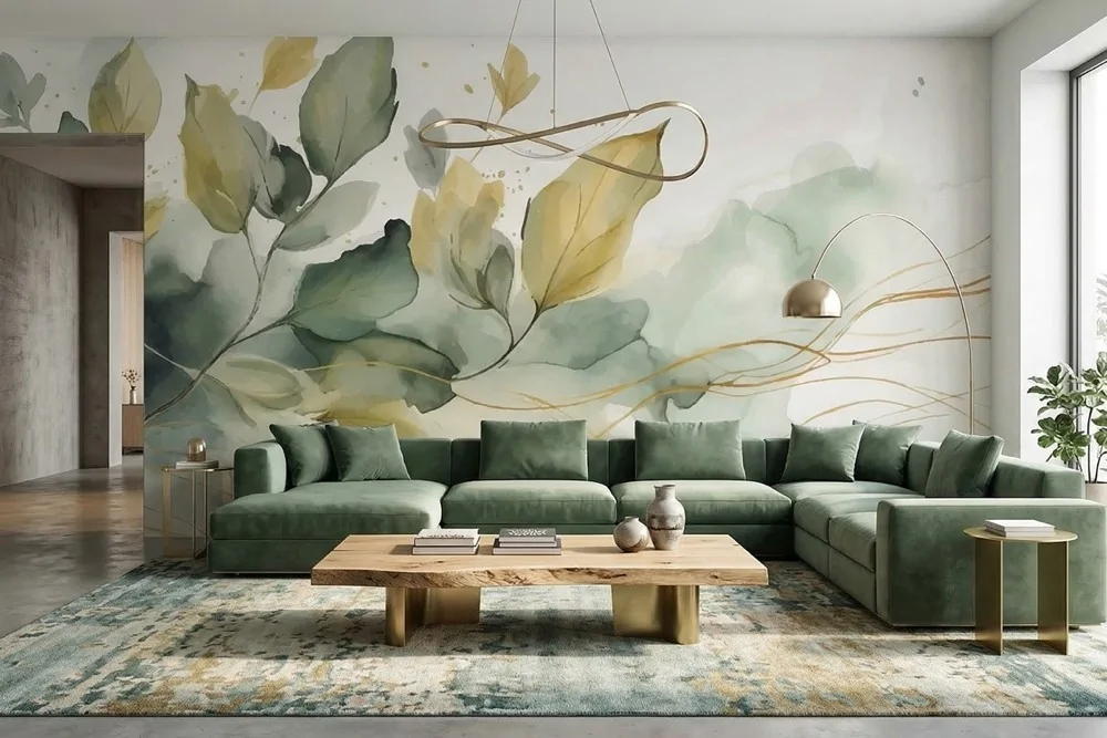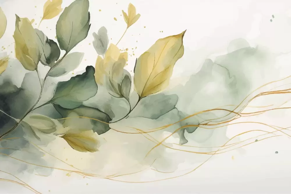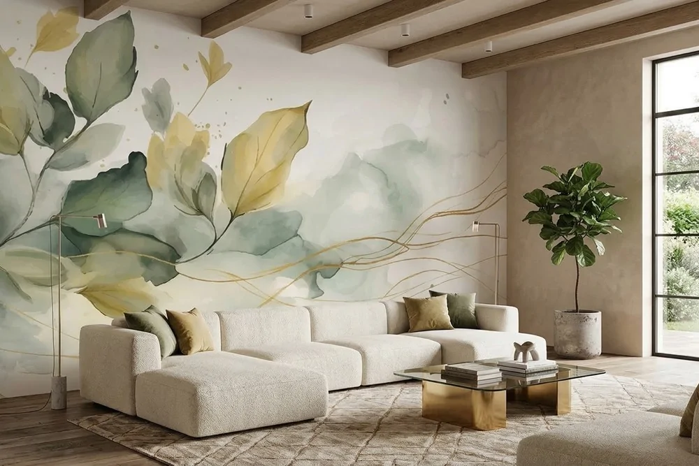 Carta da parati foglie delicate acquerello, morbida e rilassante. Ideale per zone giorno luminose. Realizzata con materiali sostenibili.