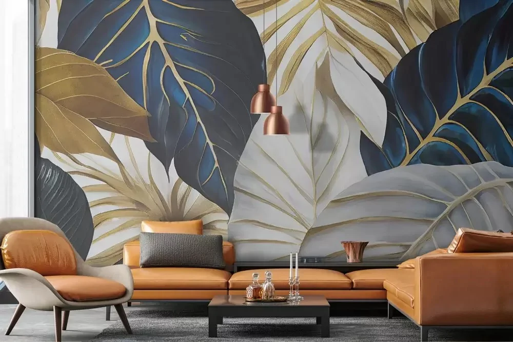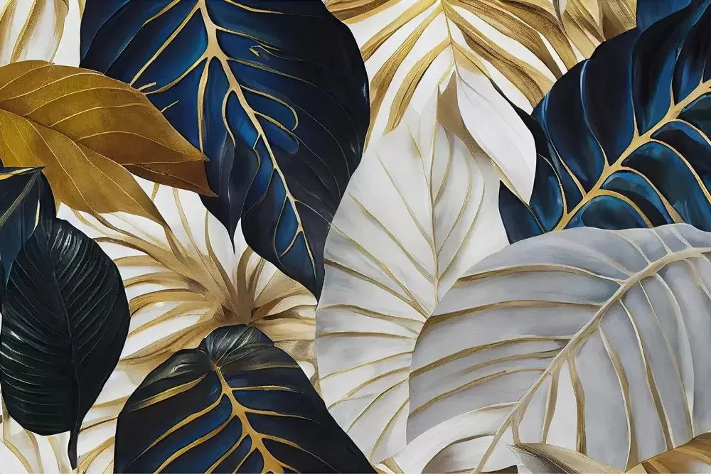 Carta da parati foglie eleganti con venature oro, grafica e contemporanea. Ideale per soggiorni eleganti. Inchiostri a base d’acqua, atossici.