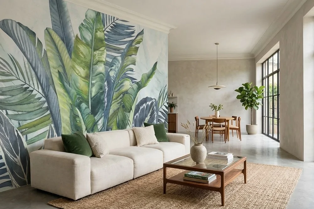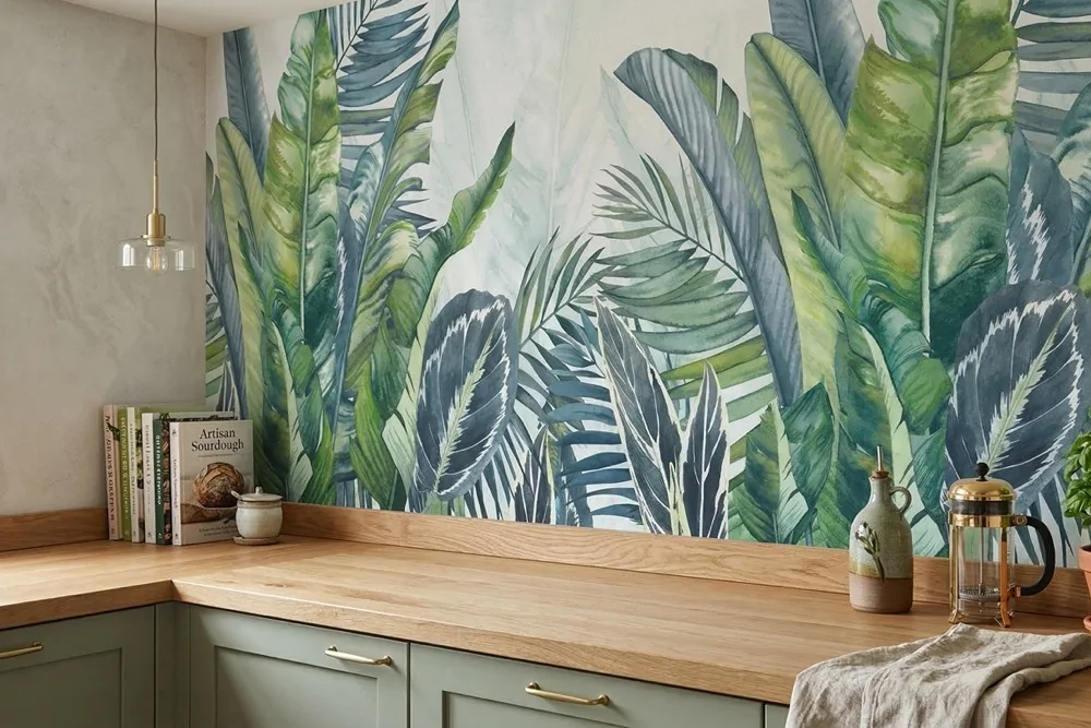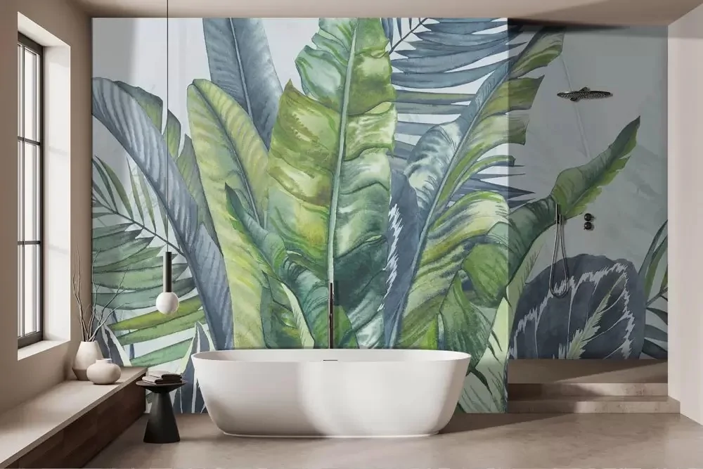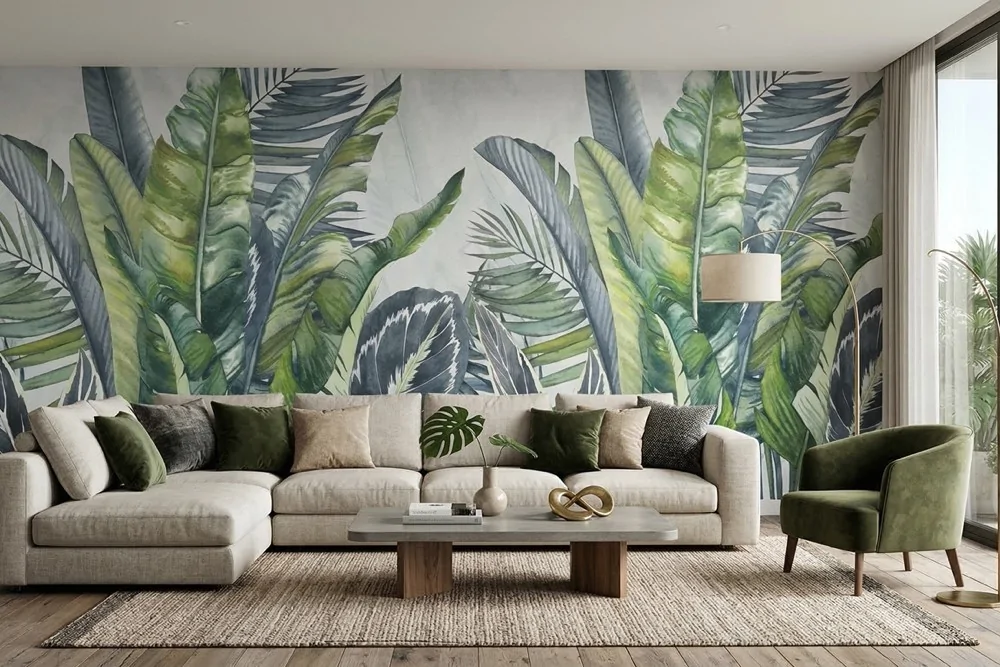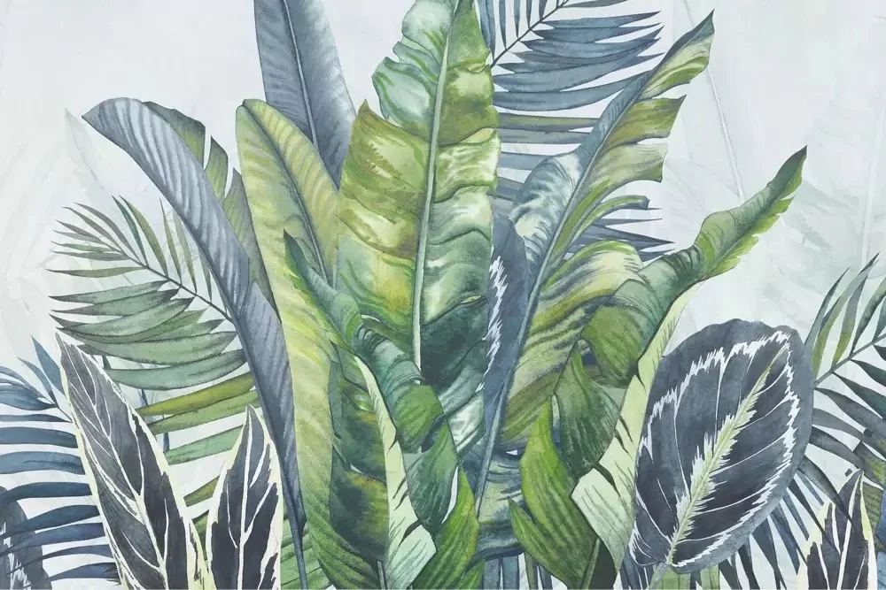 Carta da parati foglie rigogliose verdi e blu, raffinata e moderna. Ideale per zone giorno luminose. Personalizzabile su misura.