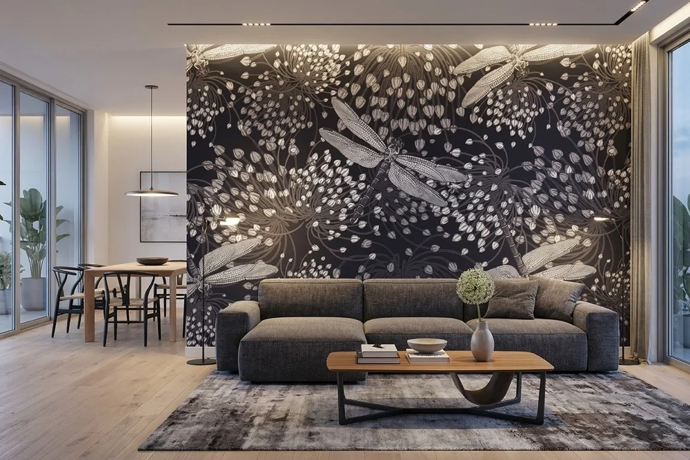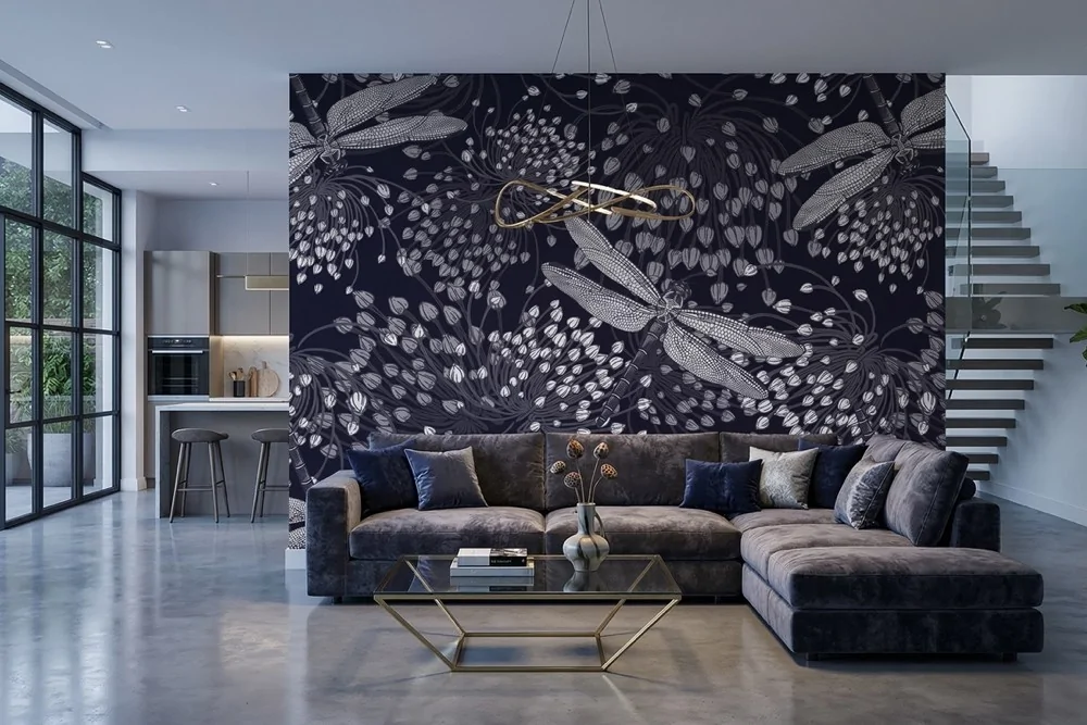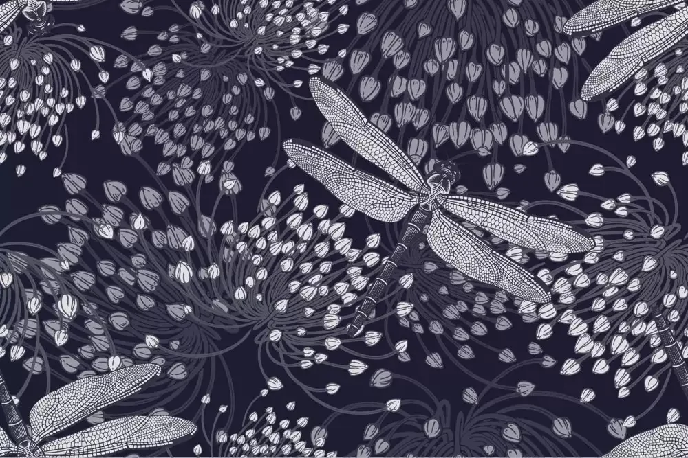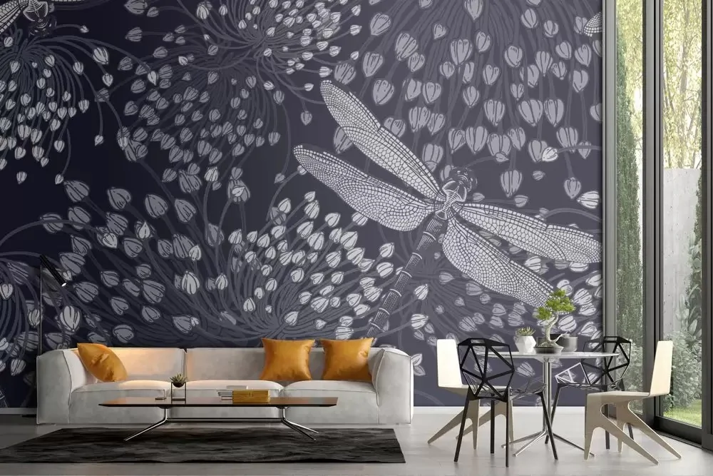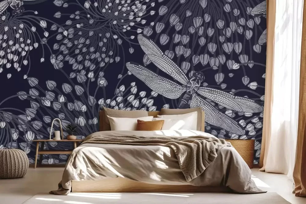 Carta da parati libellule notturne, delicata e armoniosa. Ideale per ambienti moderni. Ecologica e personalizzabile.