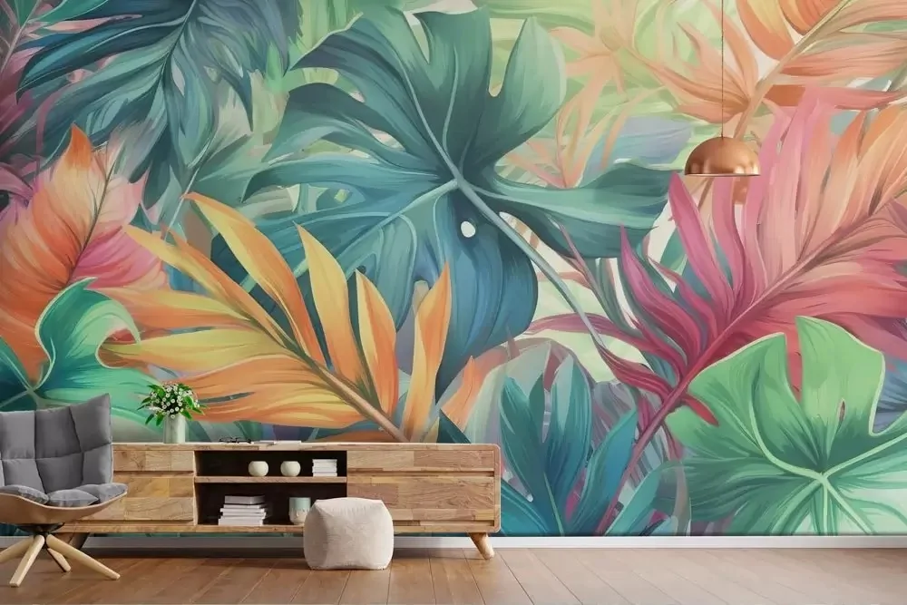 Carta da parati foglie tropicali colorate e vivaci, scenografica e di carattere. Ideale per zone giorno luminose. Personalizzabile su misura.