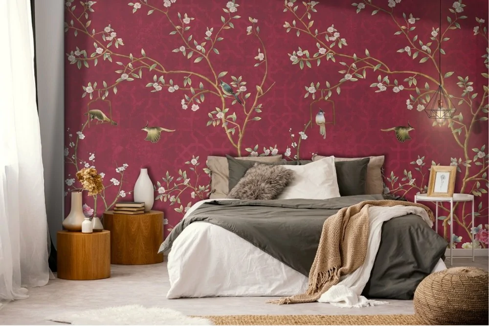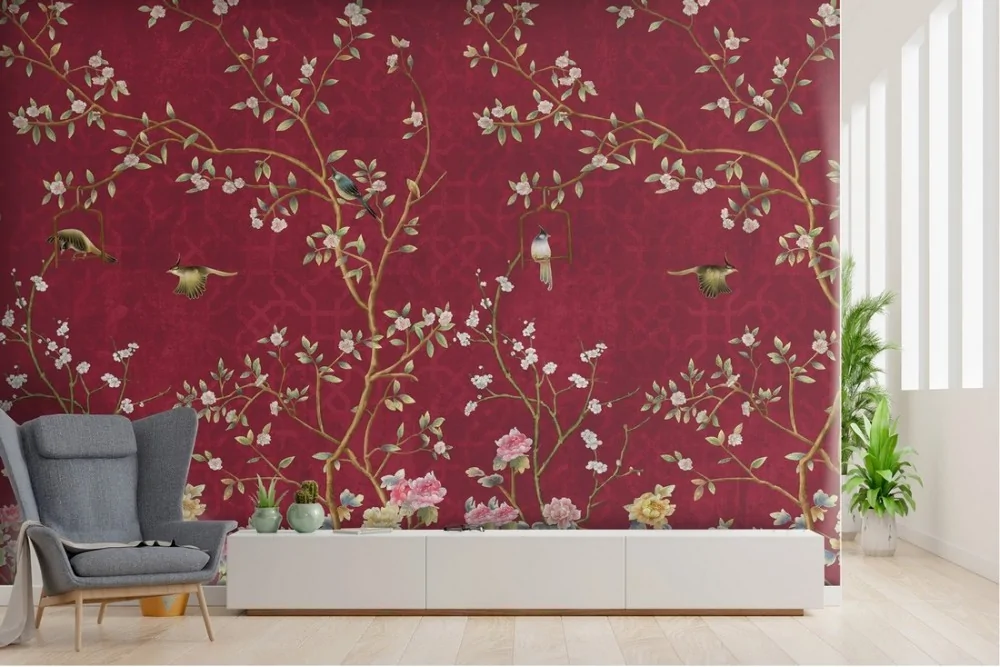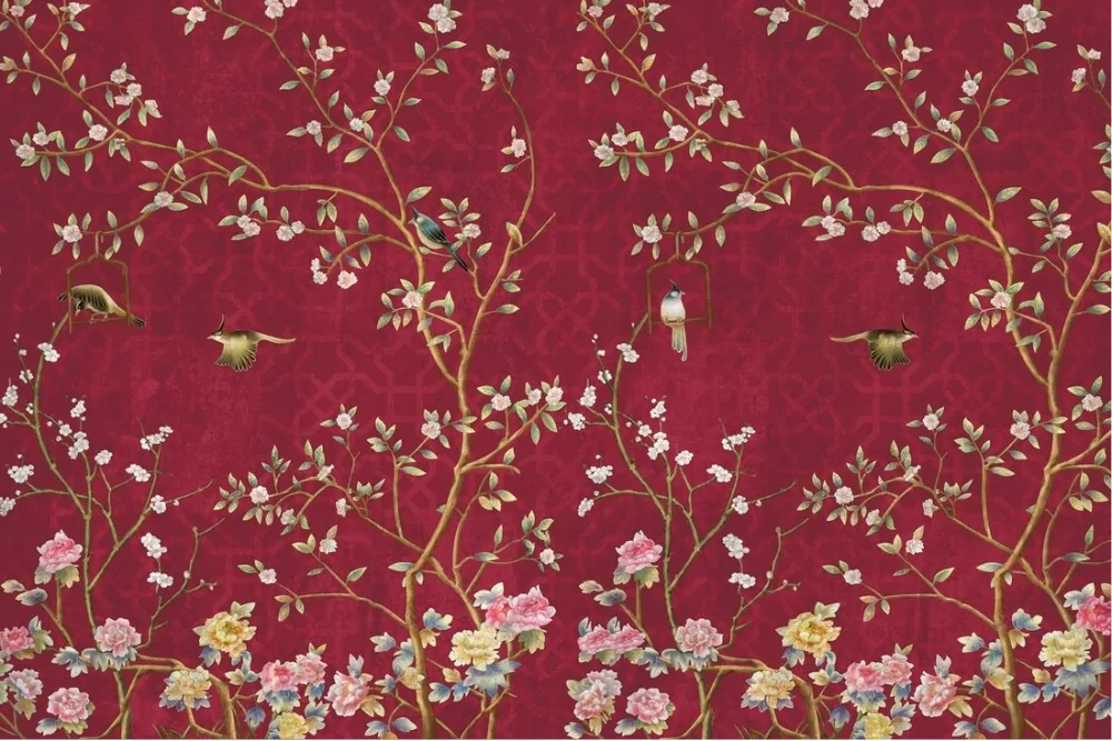 Vintage painted wallpaper with flowers and little birds nature