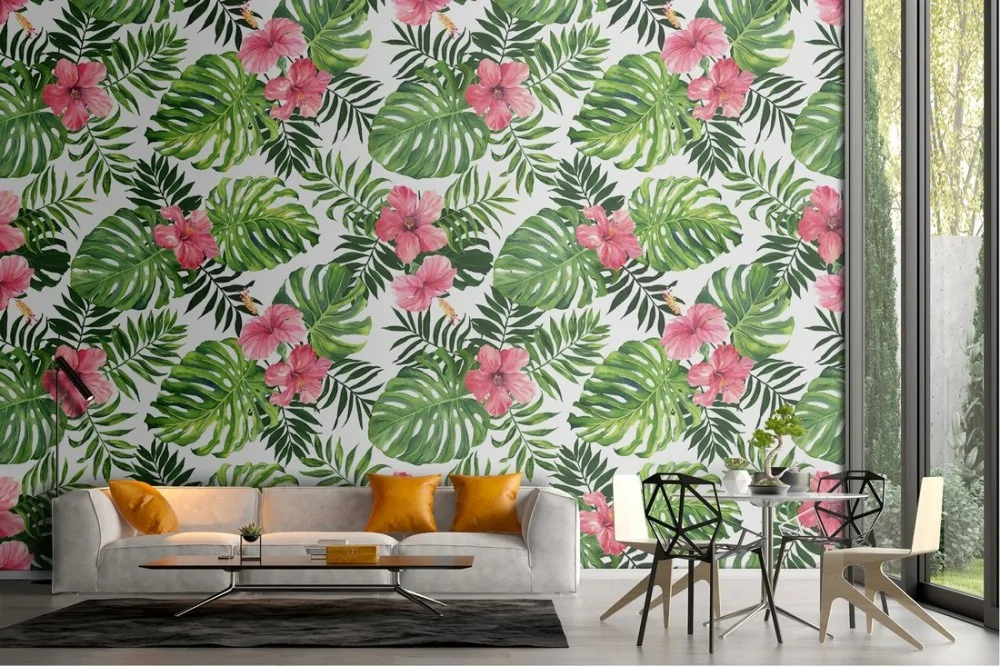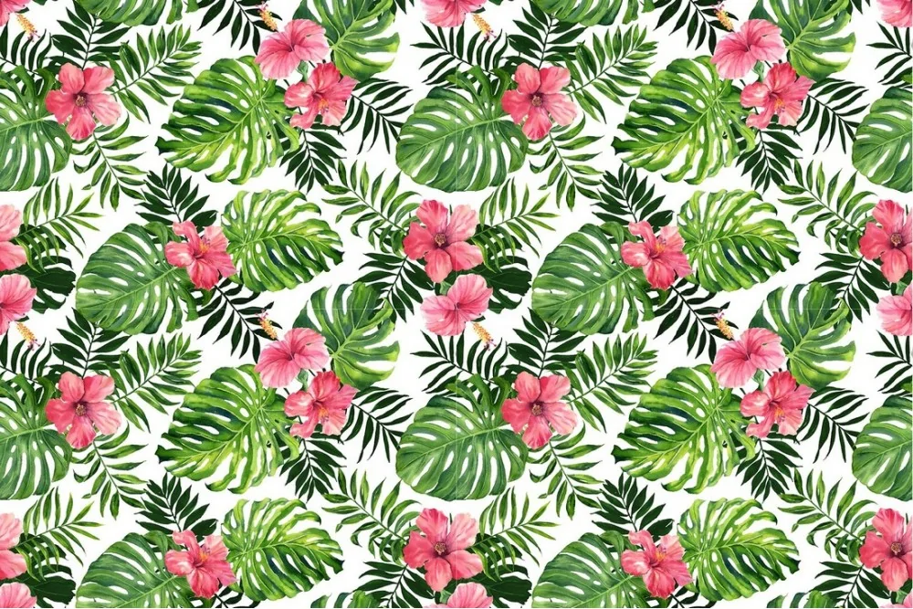 Wallpaper with abstract tropical leaves and flowers nature