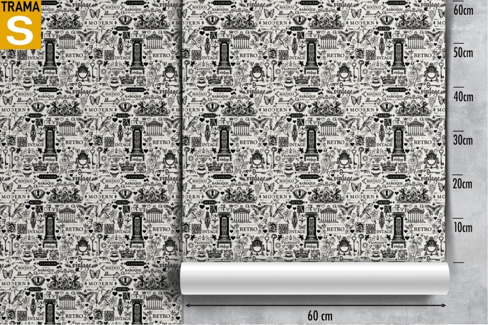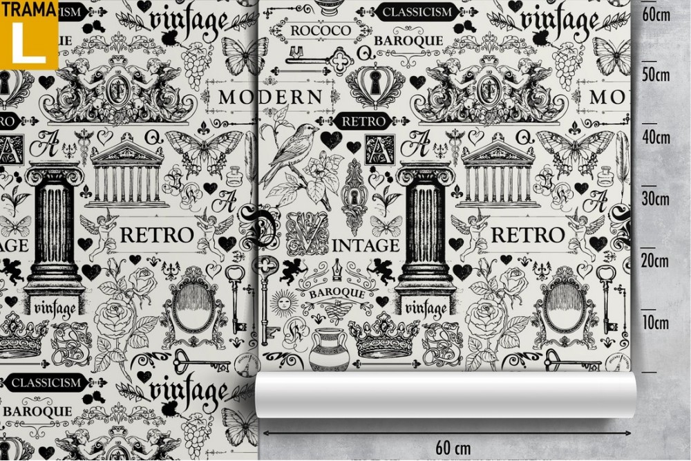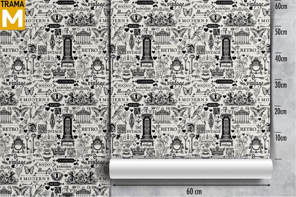 Vintage wallpaper with writings and decorations.