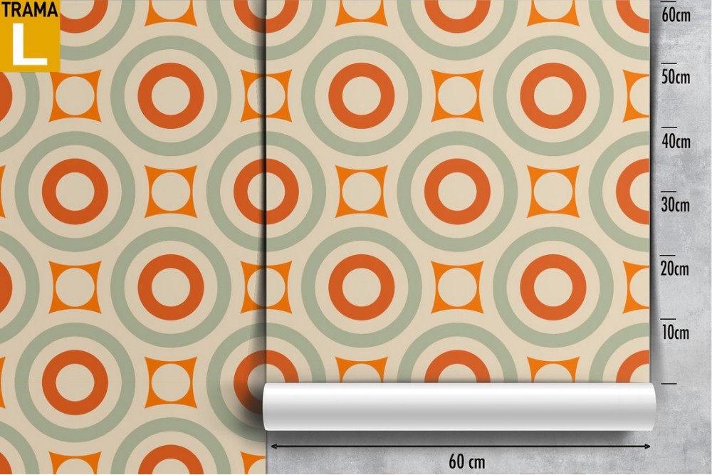 Wallpaper with circles and 70s geometric patterns.