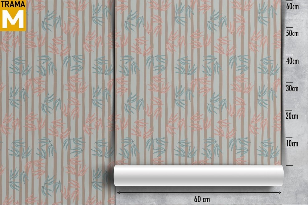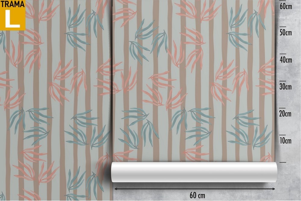 Wallpaper with stylized leaves and modern design stripes.