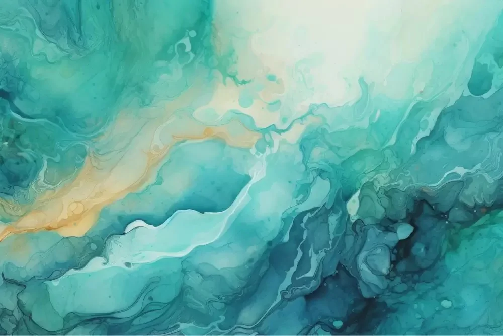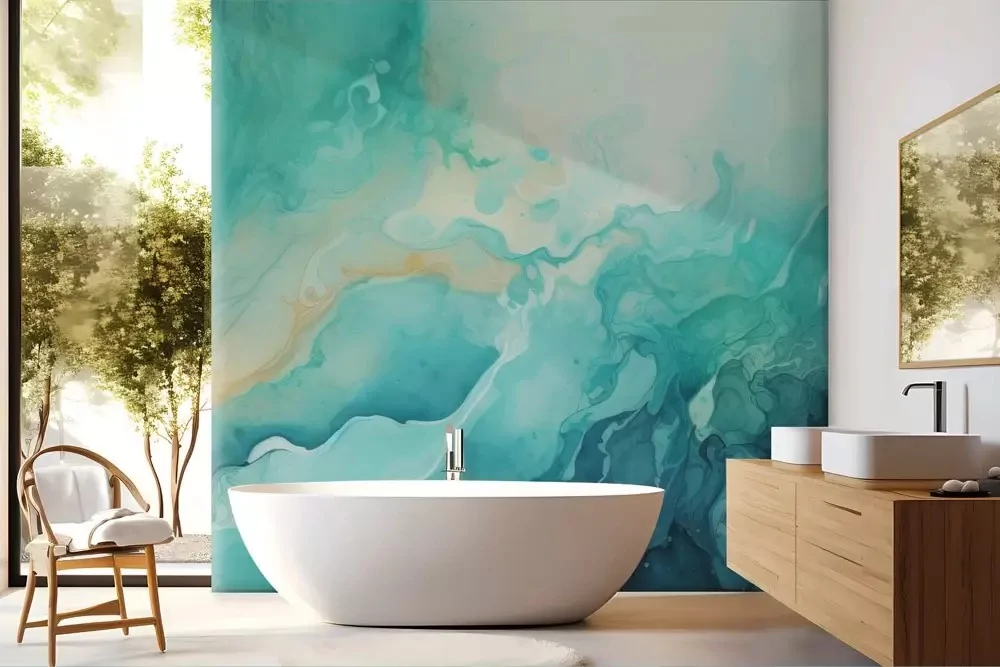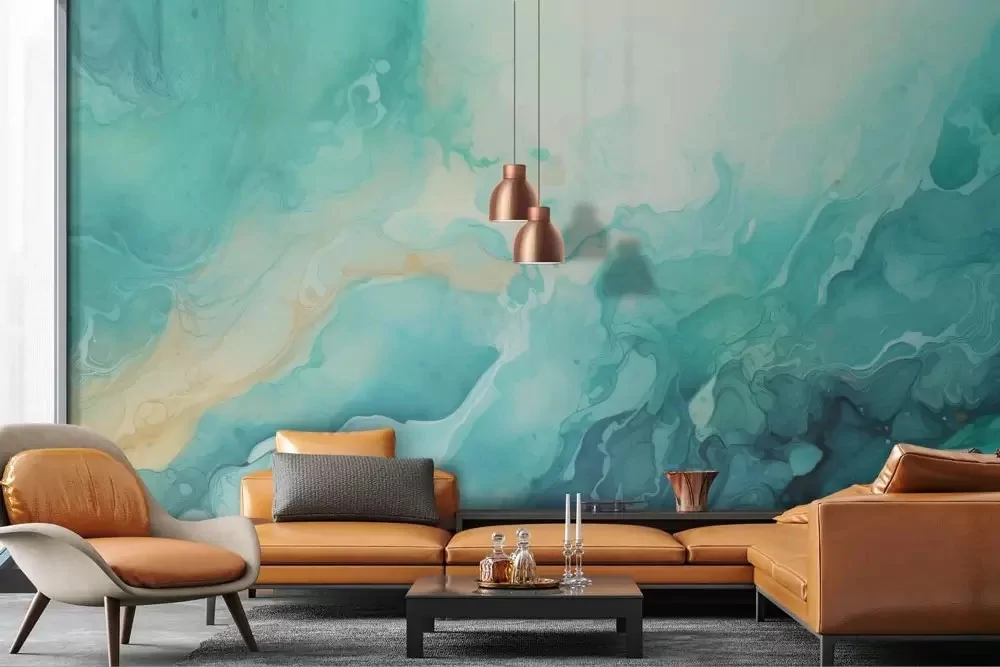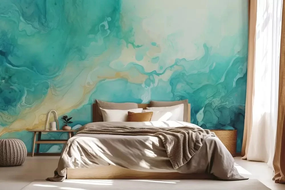 Carta da parati sfumature turchesi astratta, materica e avvolgente. Ideale per ambienti moderni. Inchiostri a base d’acqua, atossici.