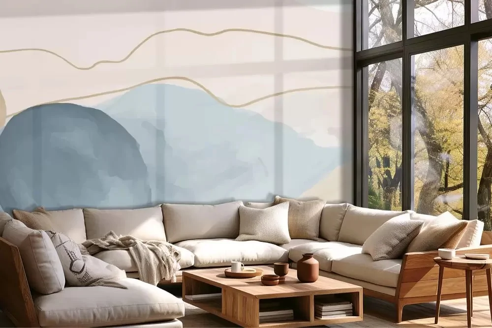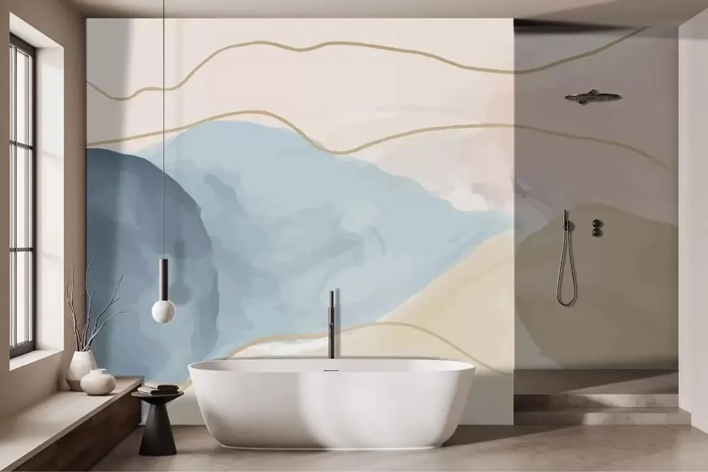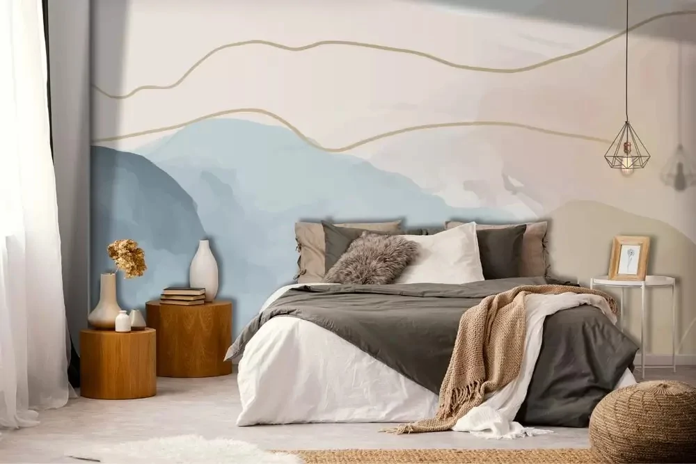 Carta da parati astratta colori pastello, morbida e rilassante. Ideale per ambienti moderni. Realizzata con materiali sostenibili.