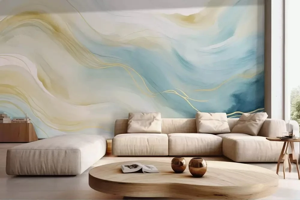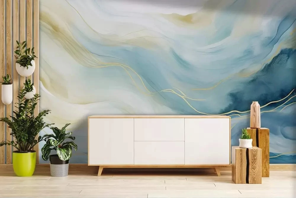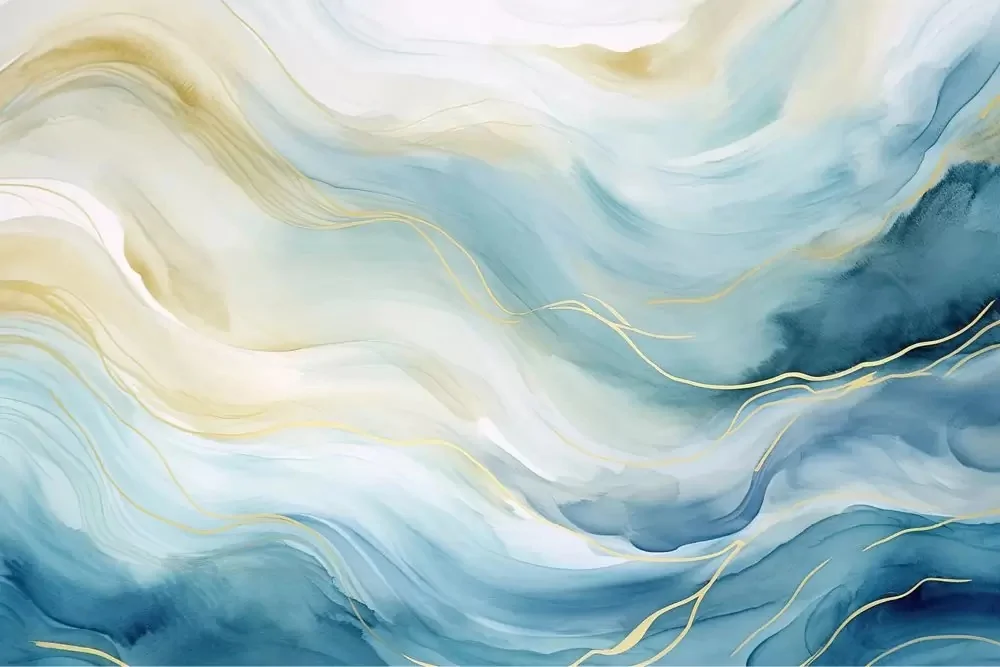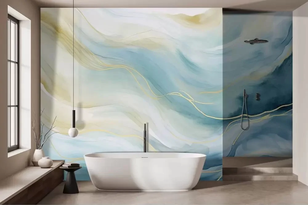 Carta da parati astratta onde blu acquerello, delicata e armoniosa. Ideale per bagni e spa domestiche. Ecologica e personalizzabile.