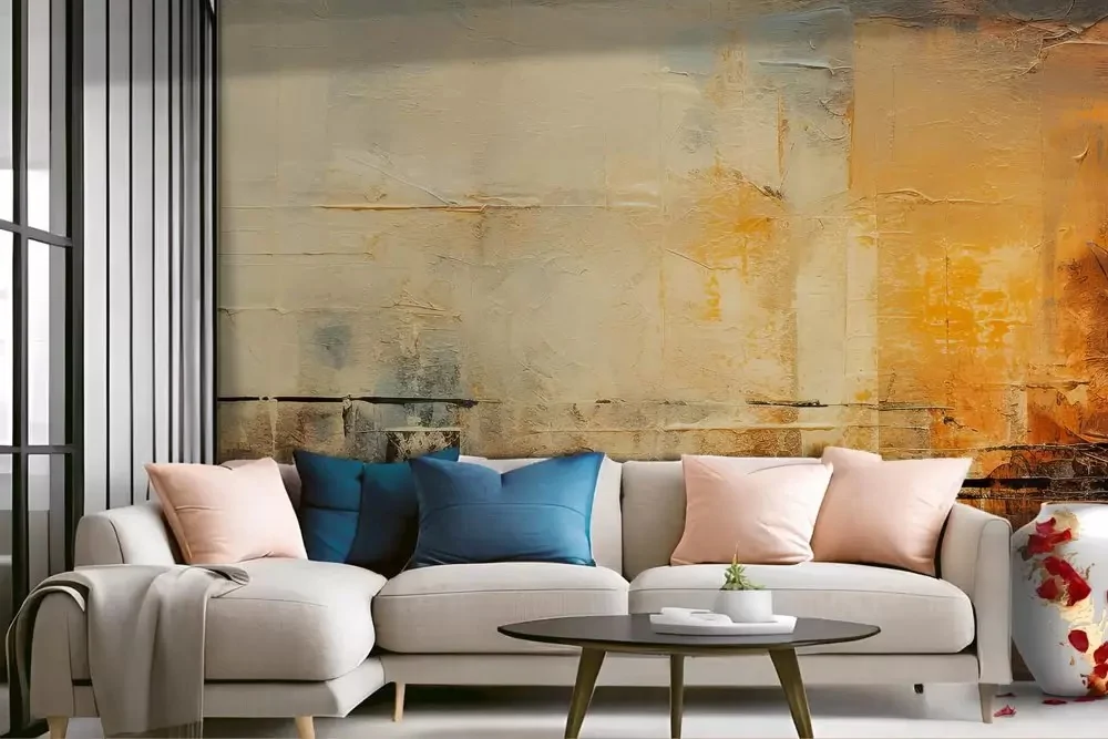 Carta da parati motivo astratto tonalità calde, vivace e naturale. Ideale per ambienti moderni. Ecologica e personalizzabile.