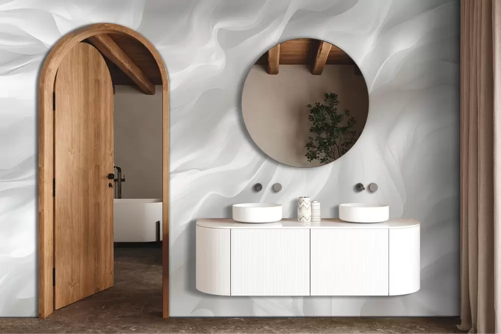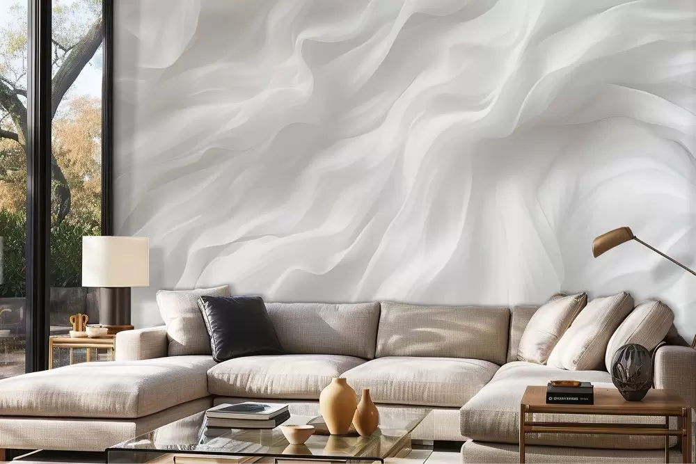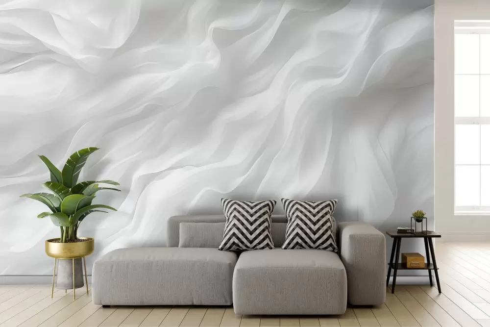 Carta da parati ondulata bianca astratta effetto 3d, scenografica e di carattere. Ideale per ambienti moderni. Personalizzabile su misura.