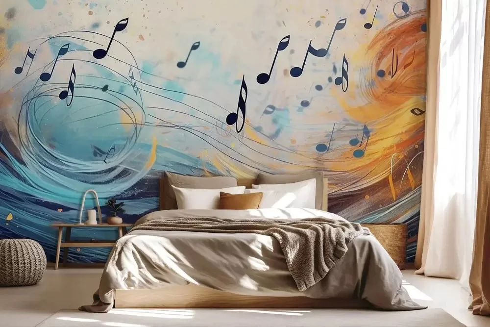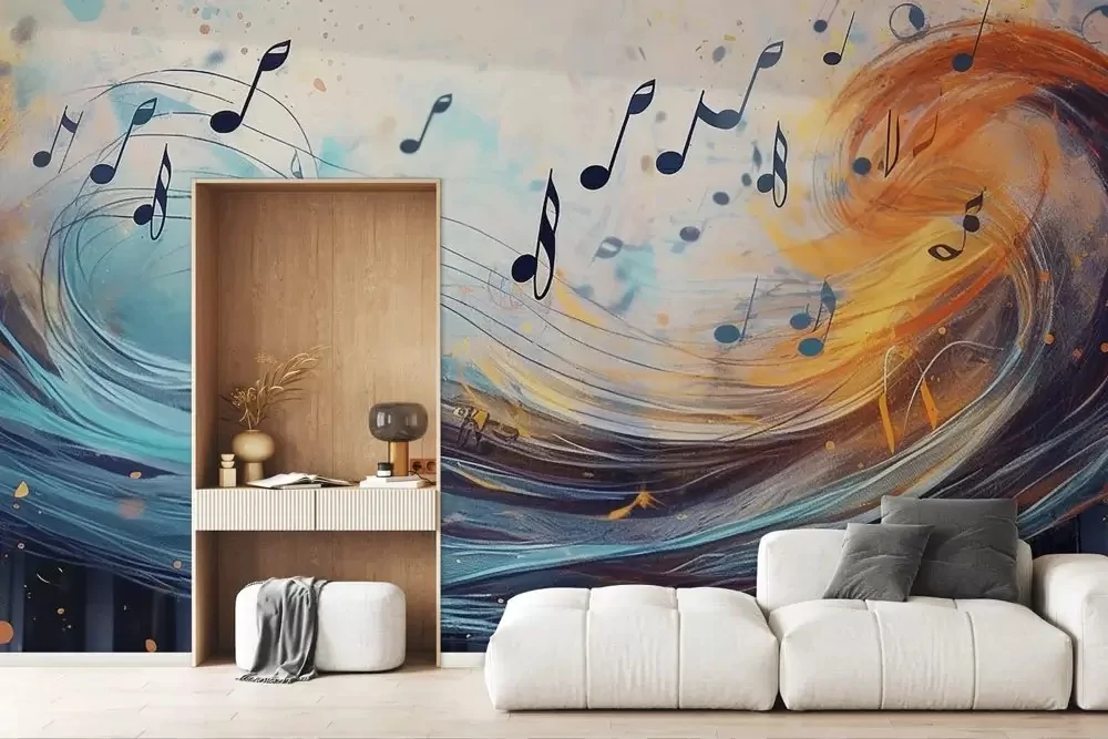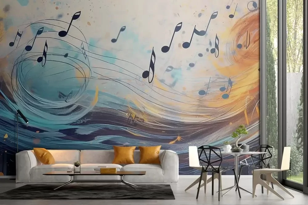 Carta da parati note musicali astratte, raffinata e moderna. Ideale per salotti e studi creativi. Personalizzabile su misura.