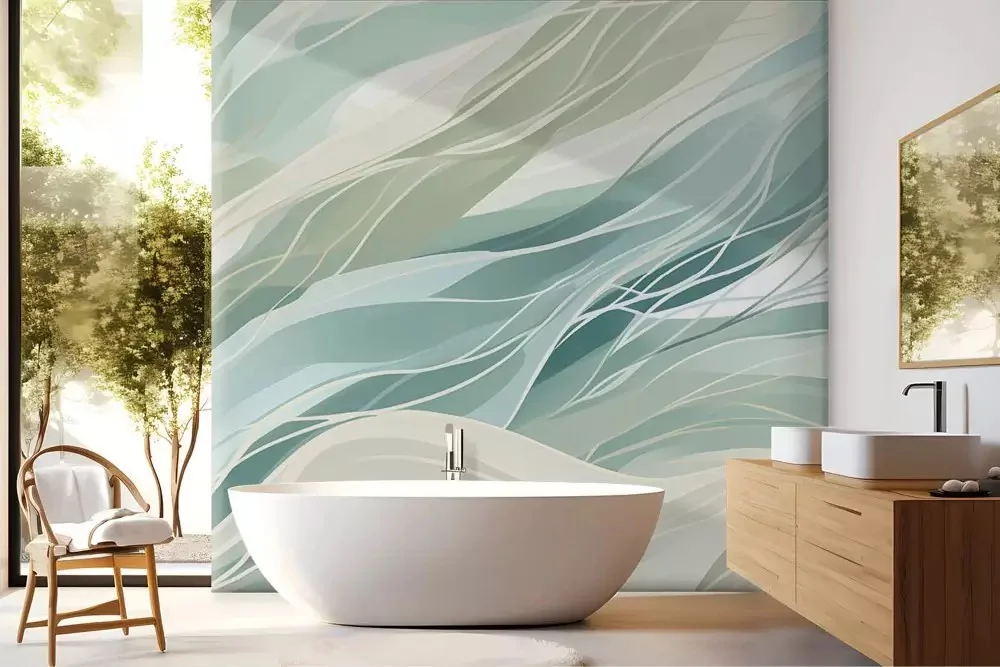 Carta da parati onde astratte tonalità del verde, delicata e armoniosa. Ideale per bagni e spa domestiche. Ecologica e personalizzabile.