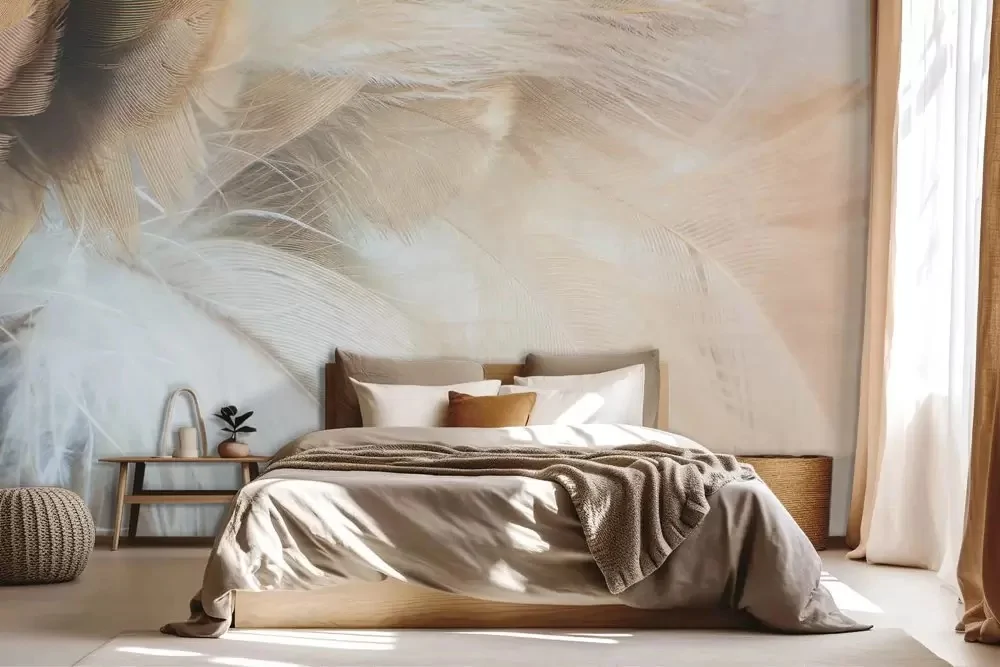 Carta da parati piume soffici cipria, sofisticata e chic. Ideale per camere da letto. Realizzata con materiali sostenibili.