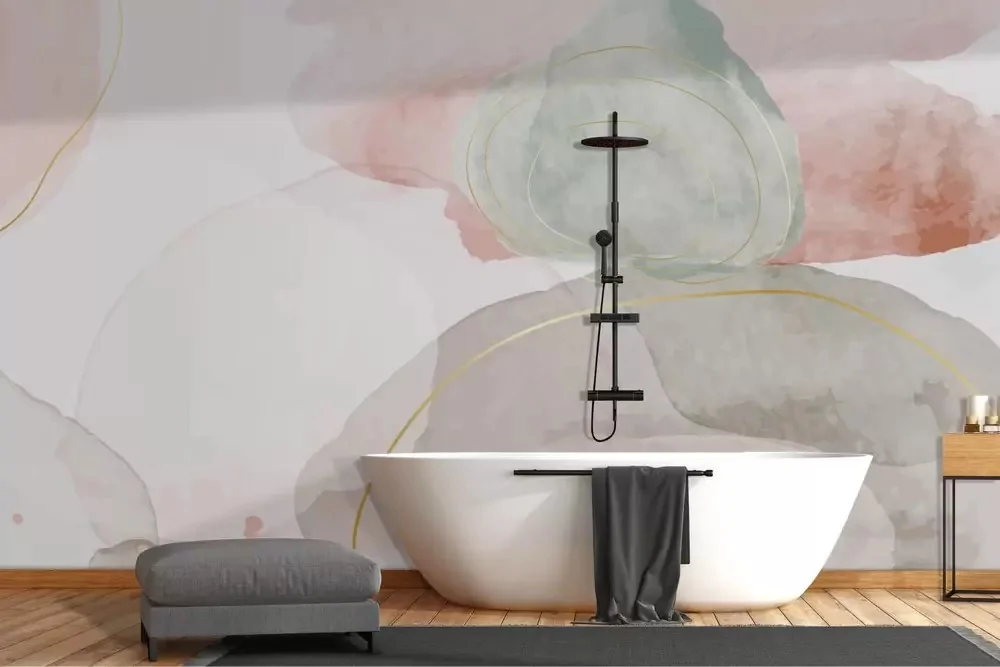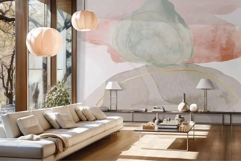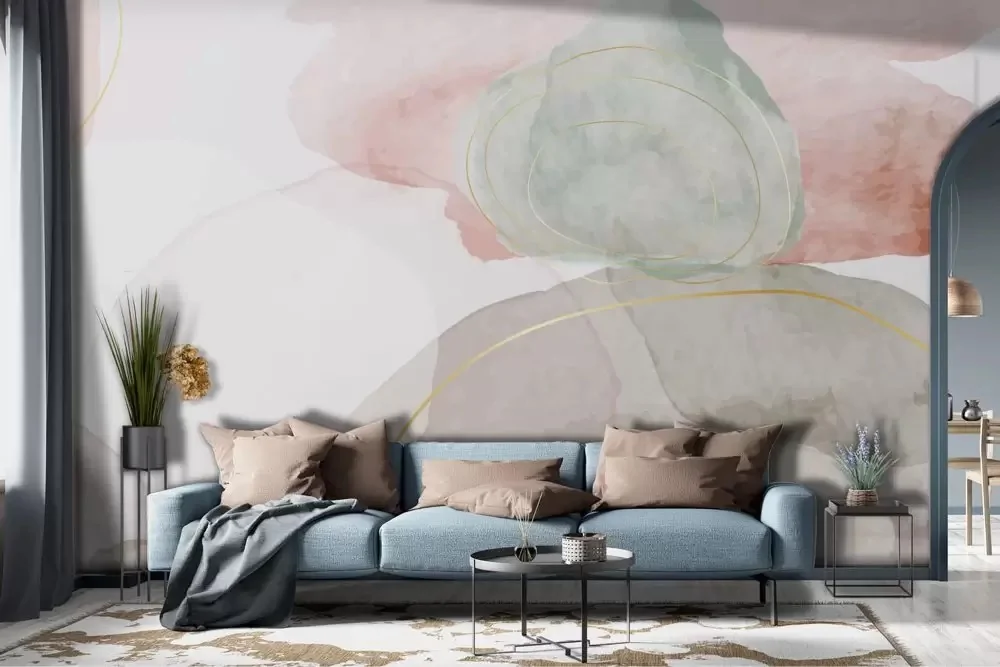 Carta da parati sfumature astratte pastello, materica e avvolgente. Ideale per ambienti moderni. Inchiostri a base d’acqua, atossici.