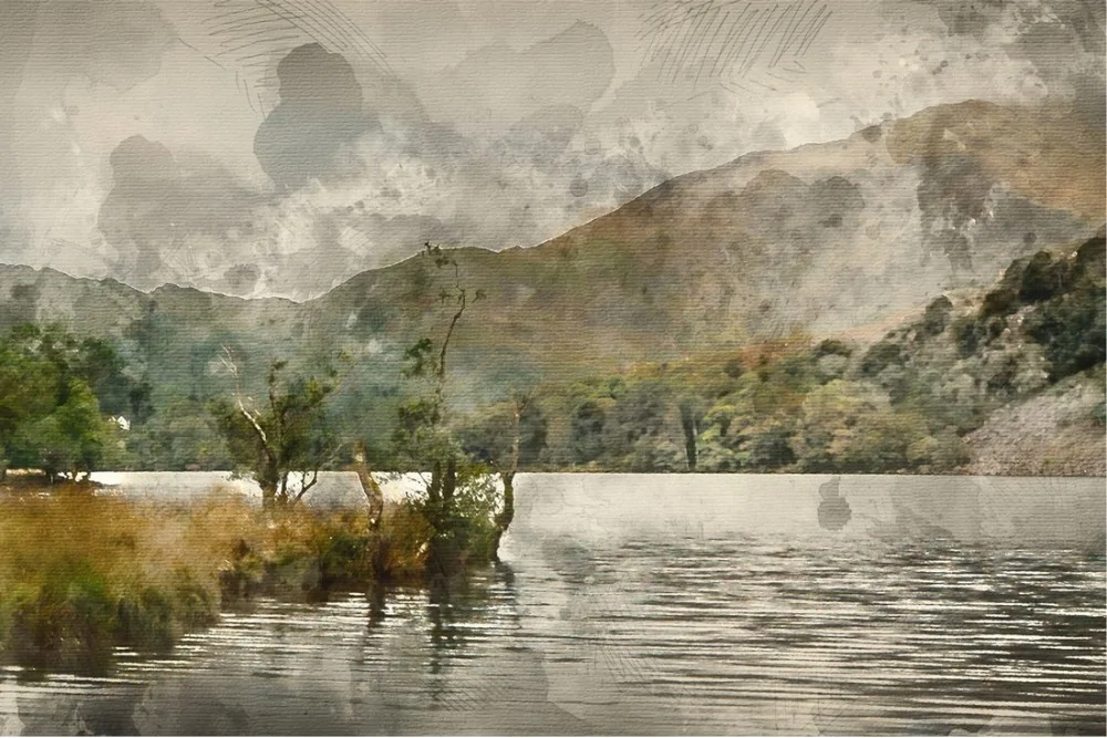 Wallpaper illustration of vintage lake with mountains