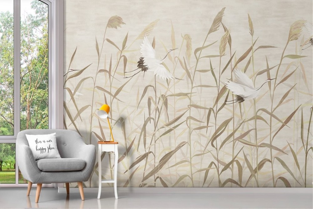 Oriental Zen Wallpaper with Leaves and Birds -a267
