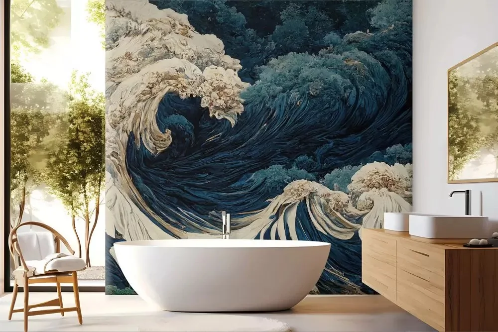 Carta da parati onde in movimento, morbida e rilassante. Ideale per bagni e spa domestiche. Realizzata con materiali sostenibili.