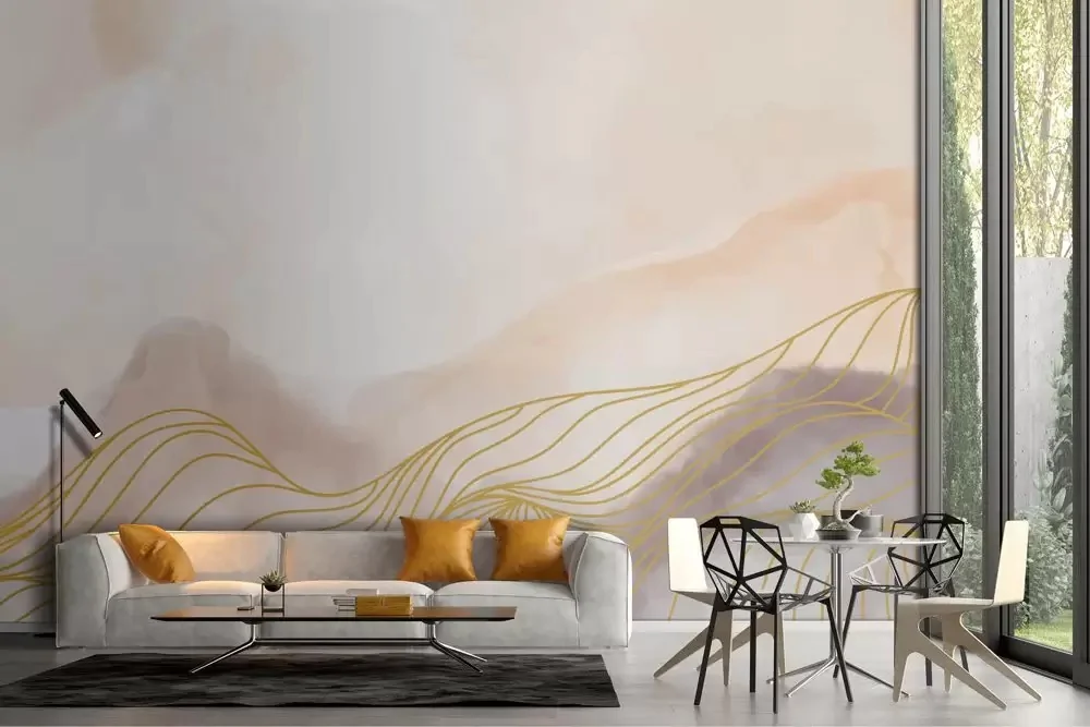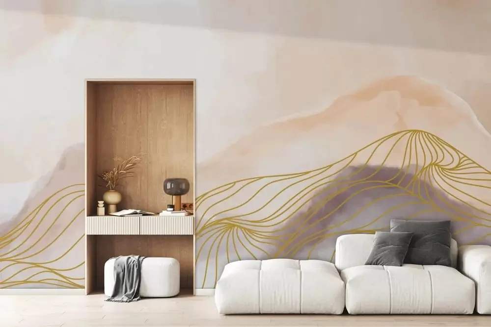 Carta da parati montagna stilizzata oro e tonalità pastello, sofisticata e chic. Ideale per zone notte e living. Realizzata con materiali sostenibili.