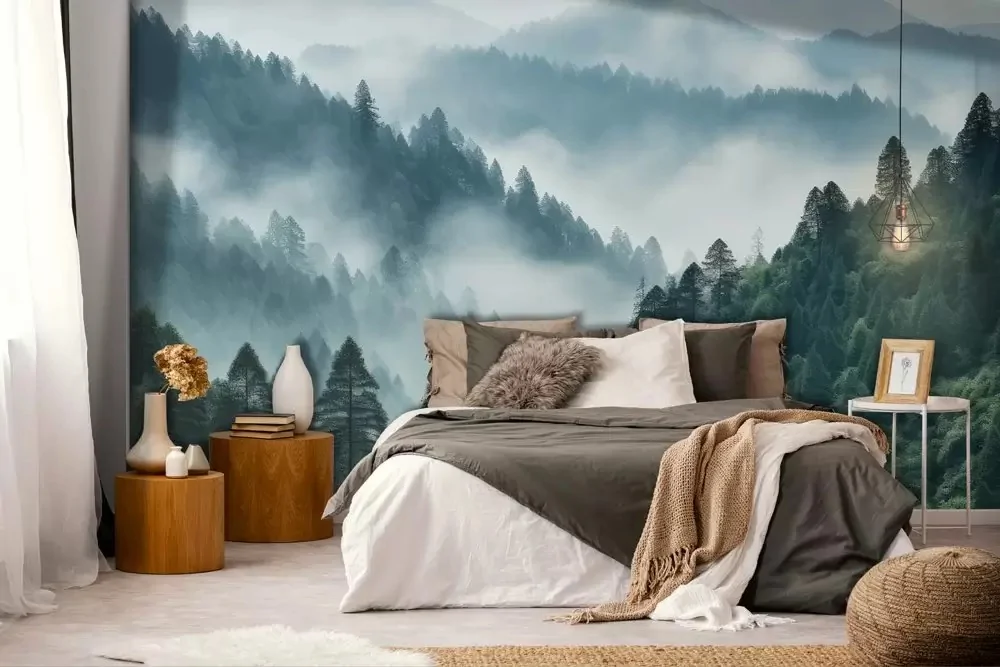 Carta da parati bosco verde con nebbia, elegante e luminosa. Ideale per zone notte e living. Artigianale italiana.
